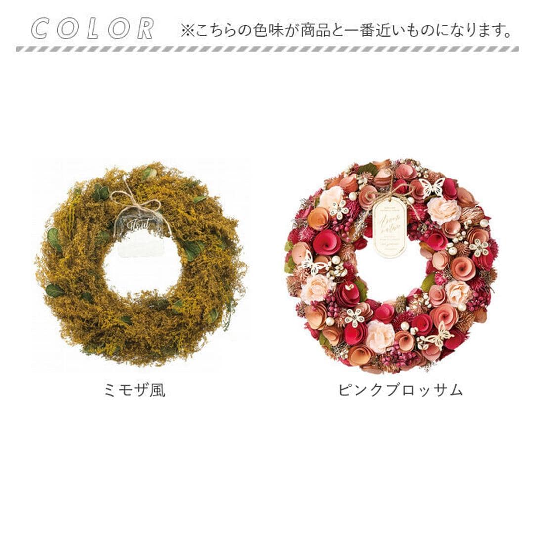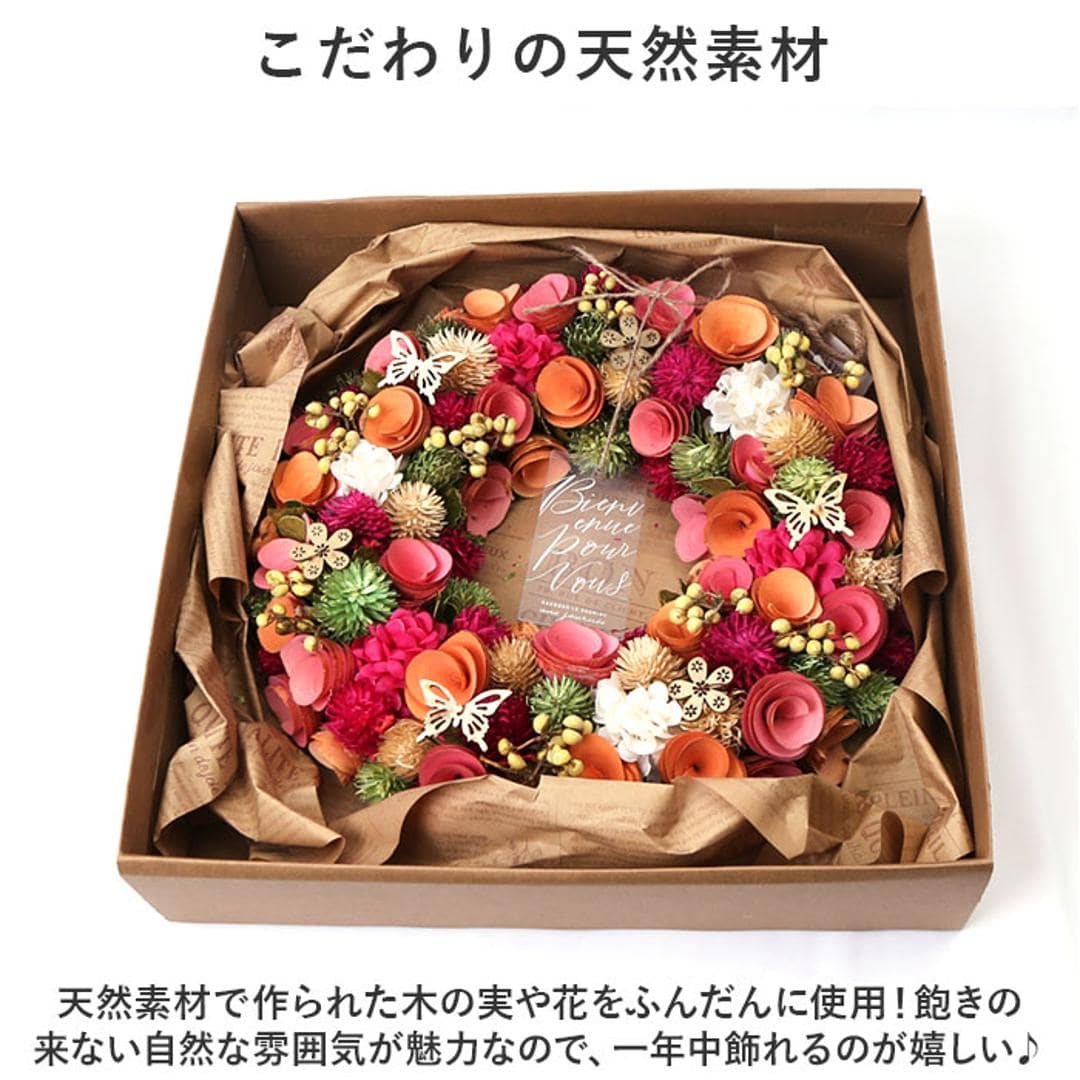 | 商品説明 | ・天然素材を使用♪一年中飾れる、ちょっぴり大人な雰囲気の「ナチュラルリース L」の登場。 【こだわりの天然素材】 ・天然素材で作られた木の実や花をふんだんに使用!飽きの来ない自然な雰囲気が魅力なので、一年中飾れるのが嬉しいポイント。 【手軽にお花をインテリアに♪】 ・お手入れが大変な生花と違い、水やりなどのお世話が必要なく季節問わず装飾できるのが嬉しいポイント! 【優しくお部屋を彩る】 ・玄関に飾って、華やかに。可愛らしいお部屋には自然に馴染み、シンプルなお部屋にはアクセントに☆場所を選ばずインテリアを優しく彩る♪ 【専用BOX付】 ・英字新聞の梱包とオシャレなタグがチラッとのぞく専用のBOX付きなので、大切な人への贈り物にもオススメ♪ |