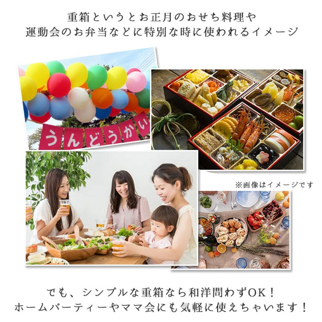 | 商品説明 | ・和の風格と可愛らしさを併せ持つ「曲げわっぱ」漆塗り二段重箱。幅21.5cm × 奥行21.5cmサイズでたっぷり入る! ・漆(うるし)塗りの曲げわっぱは耐久性に優れ、丁寧にお手入れをすれば長く使用することができる。 ・伝統的なスタイルをもつ「曲げわっぱ」の重箱は、流れる木目と漆の色合いが美しい。 ・上下二段のファミリーサイズ(56人用)。 ・十字型の間仕切り付きなので、おかずの盛り付けがラクラク♪ ・漆自体に優れた抗菌作用があり、調湿作用も発揮。ご飯の余分な水分を逃がすことで傷みにくく、美味しさをキープ。 ・油ものにも強く、洗う時も中性洗剤の使用が可能。(※水のつけ置きはしないでください。) ・仕上げは乾拭きですむので取扱い方法も簡単。 ・自然の風合いを贅沢に生かした素材感は、日常使いだけでなく行楽などの場を華やかに彩る。 |