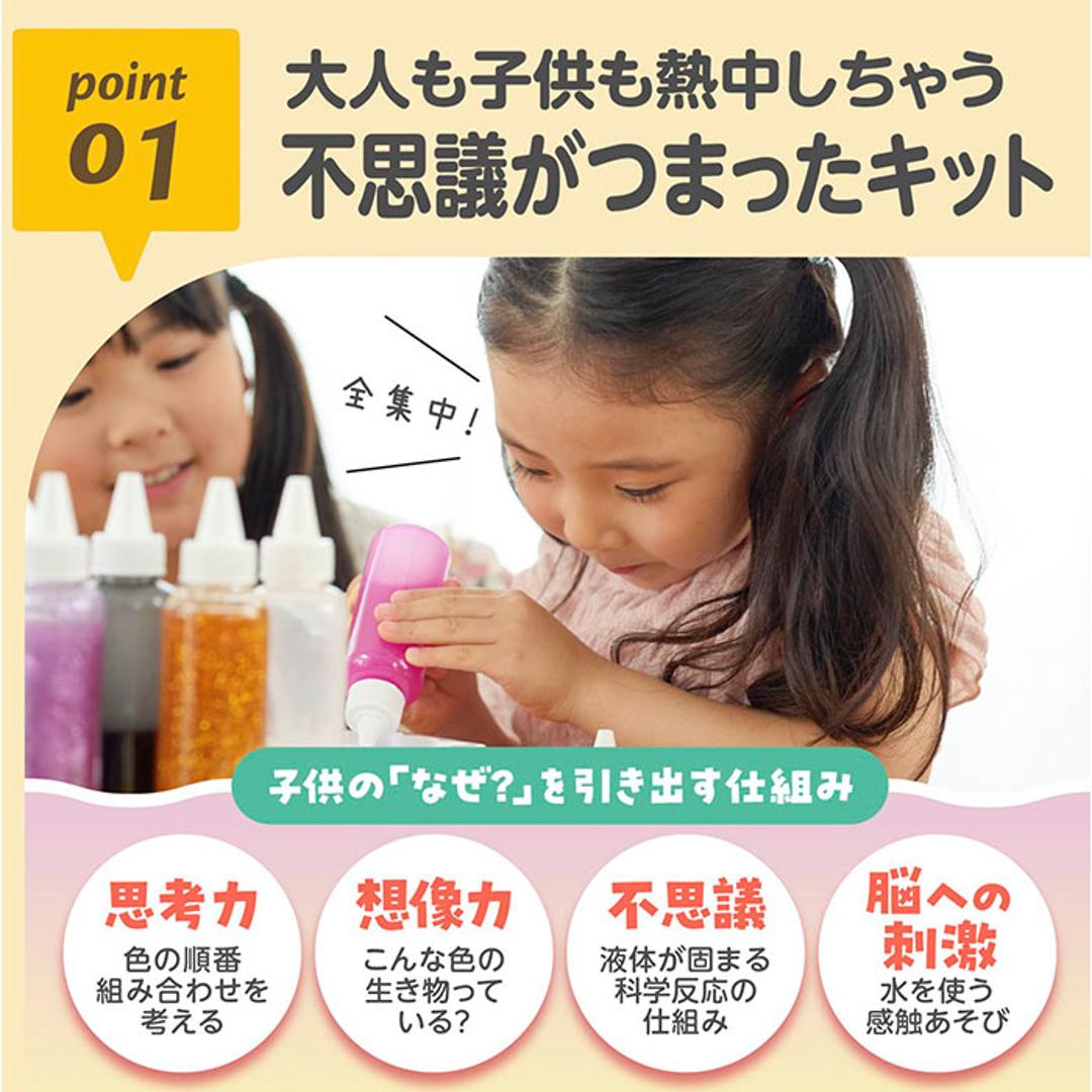 | 素材 | [カラーインク] 水、ヒドロキシプロピルメチルセルロース アルギン酸ナトリウム、顔料 [凝固パウダー]塩化カルシウム [型]ポリプロピレン [ボールチェーン]鉄 [チャック付きパウチ]EVA [デコレーションシール]コート紙 |