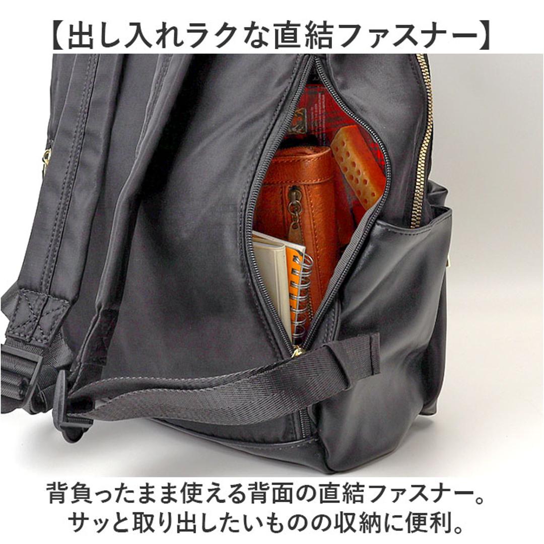 ・背負ったまま使える背面の直結ファスナー。サッと取り出したいものの収納に便利。
