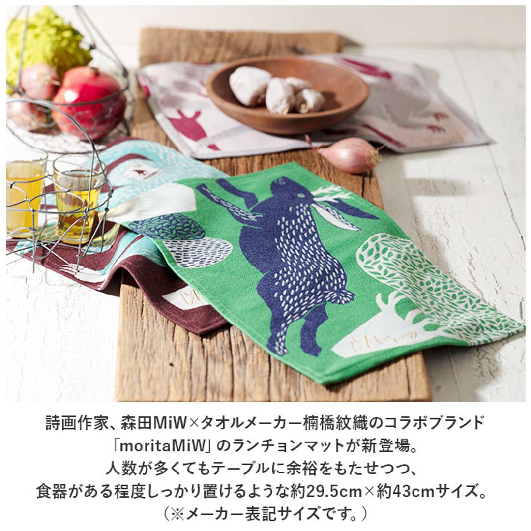 商品説明・詩画作家、森田MiW×タオルメーカー楠橋紋織のコラボブランド「moritaMiW」のランチョンマットが新登場。