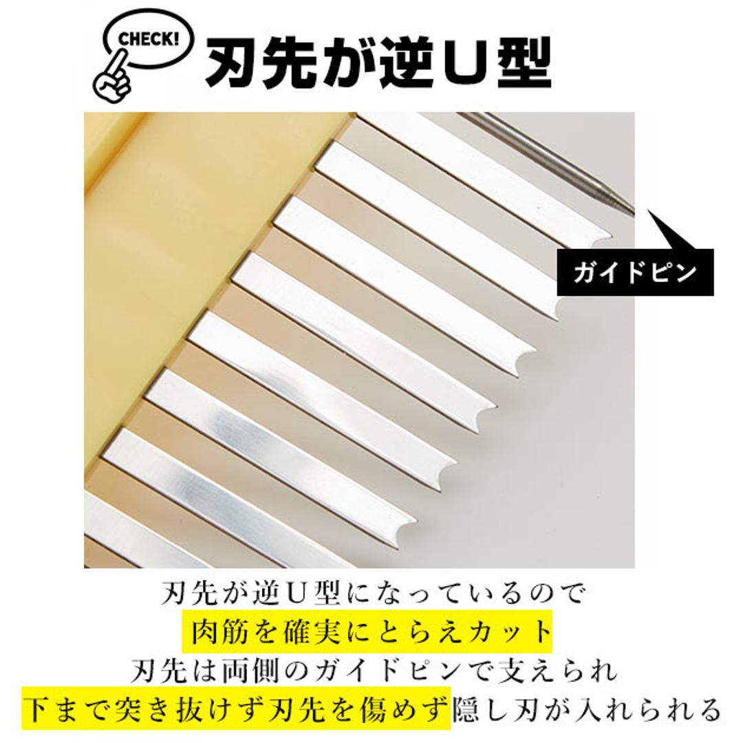 刃先が逆U型になっているので血筋を確実にとらえてカット!火の通りがよく、味がよくしみます。押し当てるだけでとっても簡単にとっても美味しくなるんです♪刃先は両側のガイドピンで支えられ、下まで突き抜けませんので、刃先を傷めず隠し刃が入れられます。 また、プロテクターは取り外せるので内面が洗えて衛生的に使えます。細切れ肉にもお使いください☆