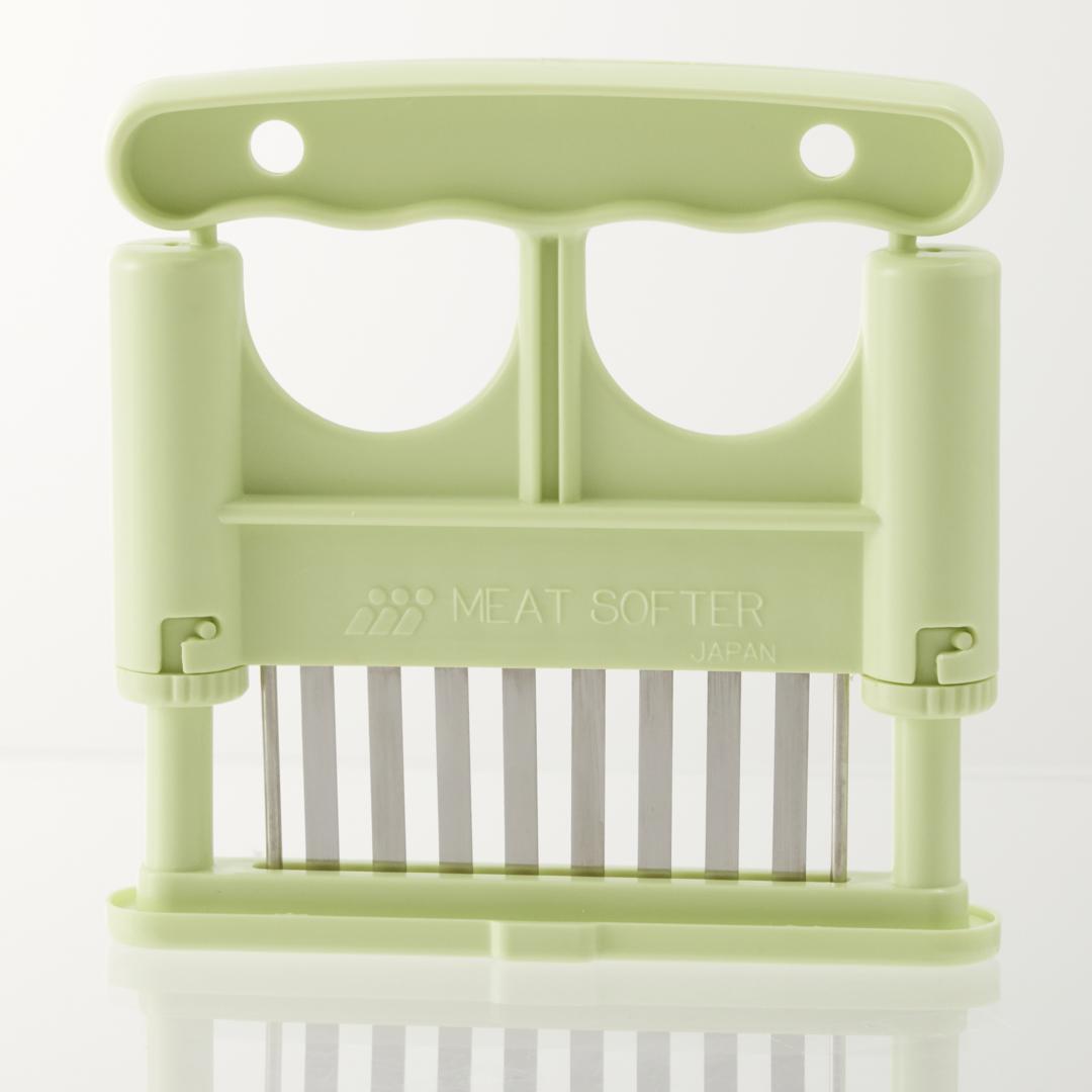 商品説明牛肉・豚肉・鶏肉等あらゆる固い食肉の繊維やスジをカットし、肉をやわらかく食べやすくする肉の筋切器ミートソフター。
