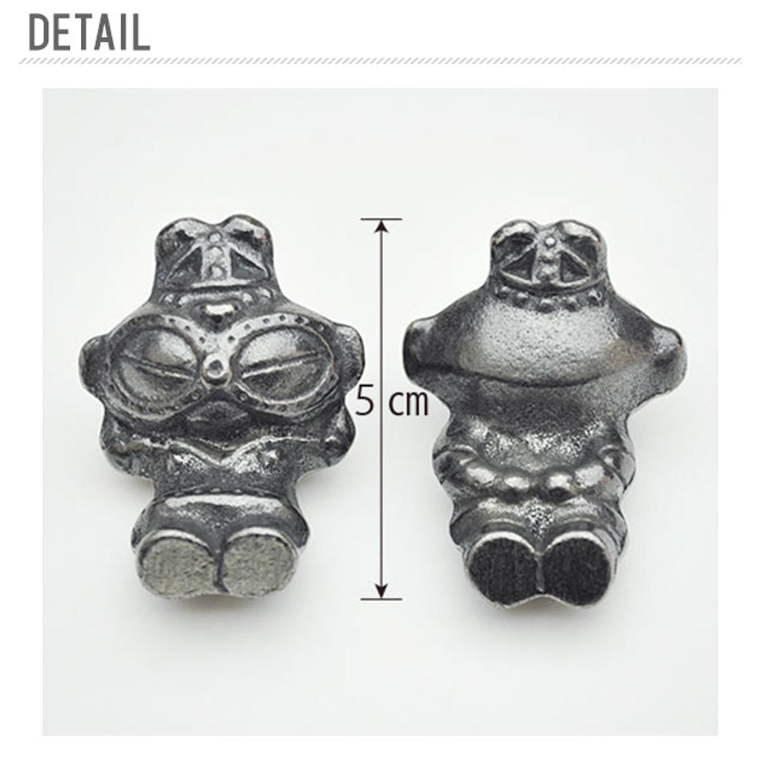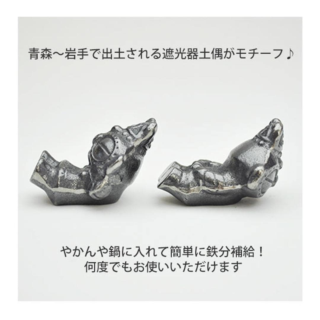 | 商品説明 | 青森岩手で多く出土される遮光器土偶をモチーフとしたやかんやお鍋に入れて使う鉄です。鉄分のほか、貝の砂出し、なす漬けの色だし、黒豆の色出しや、箸置きやペーパーウエイトとしても使える鉄です。 |