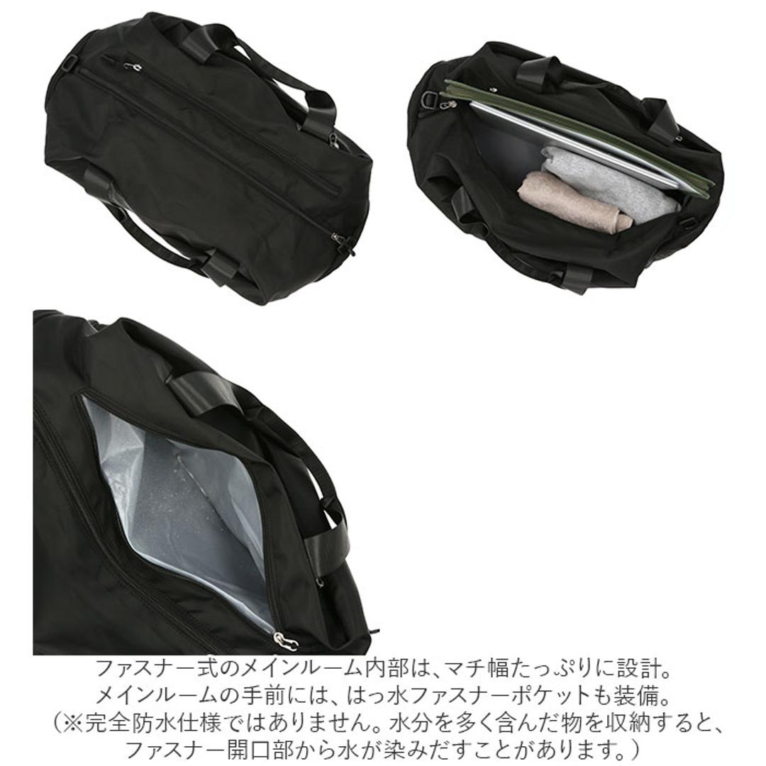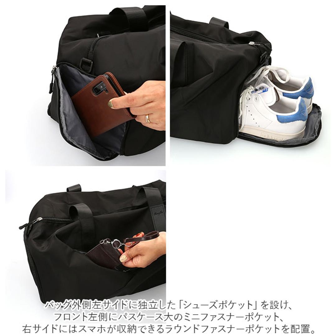 ・バッグ外側左サイドに独立した「シューズポケット」を設け、バッグの中の衣類や小物を汚さずに運動靴が収納できる便利なつくり。