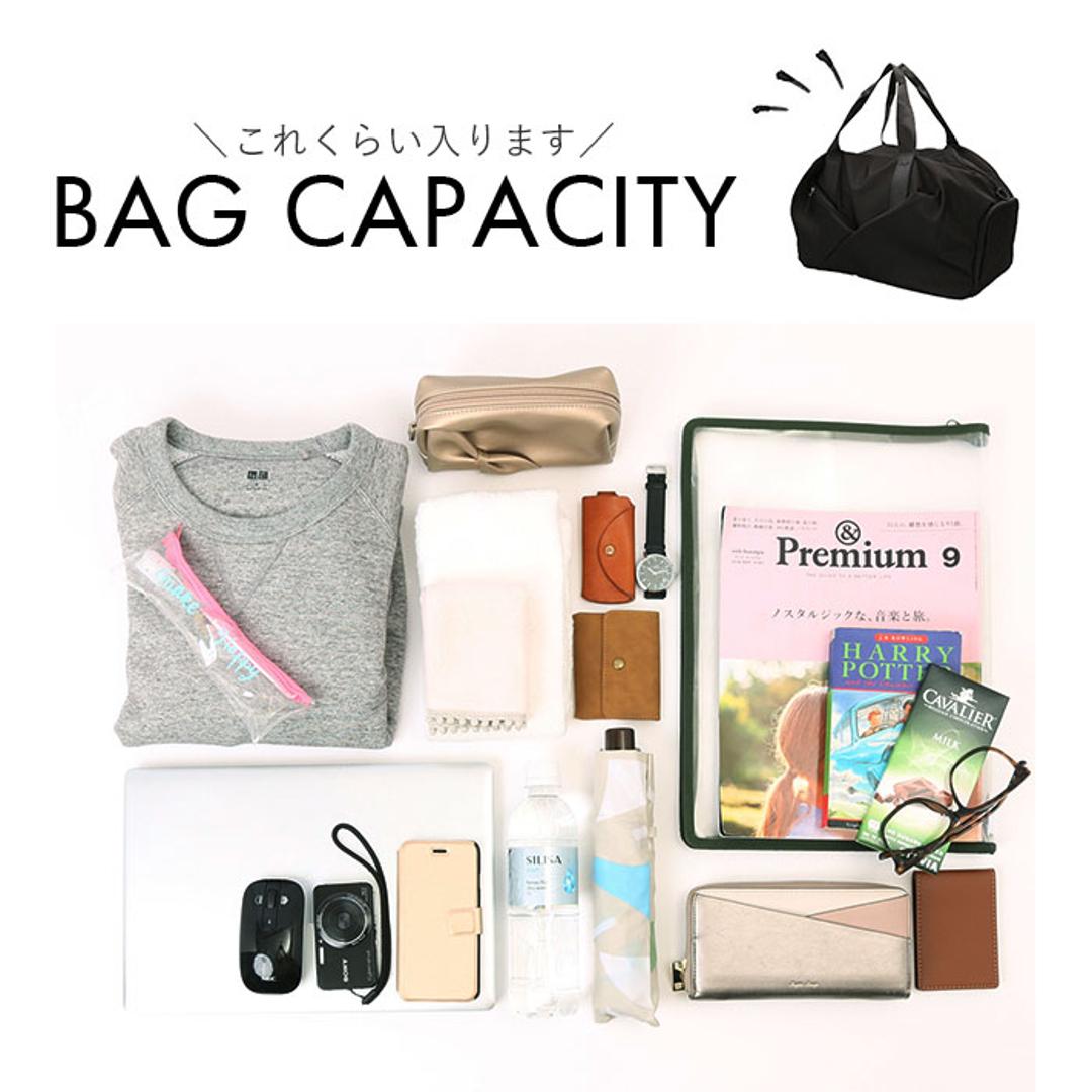 ・ファスナー式のメインルーム内部は、マチ幅たっぷりに設計。1泊2日程度の衣類や洗面ポーチ、普段使いの小物類をひとまとめにできる大容量サイズ。