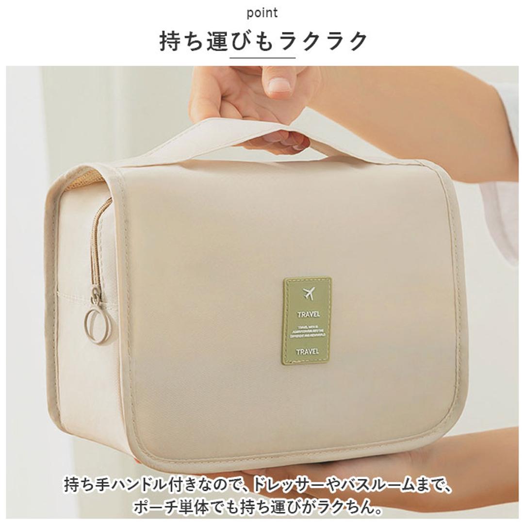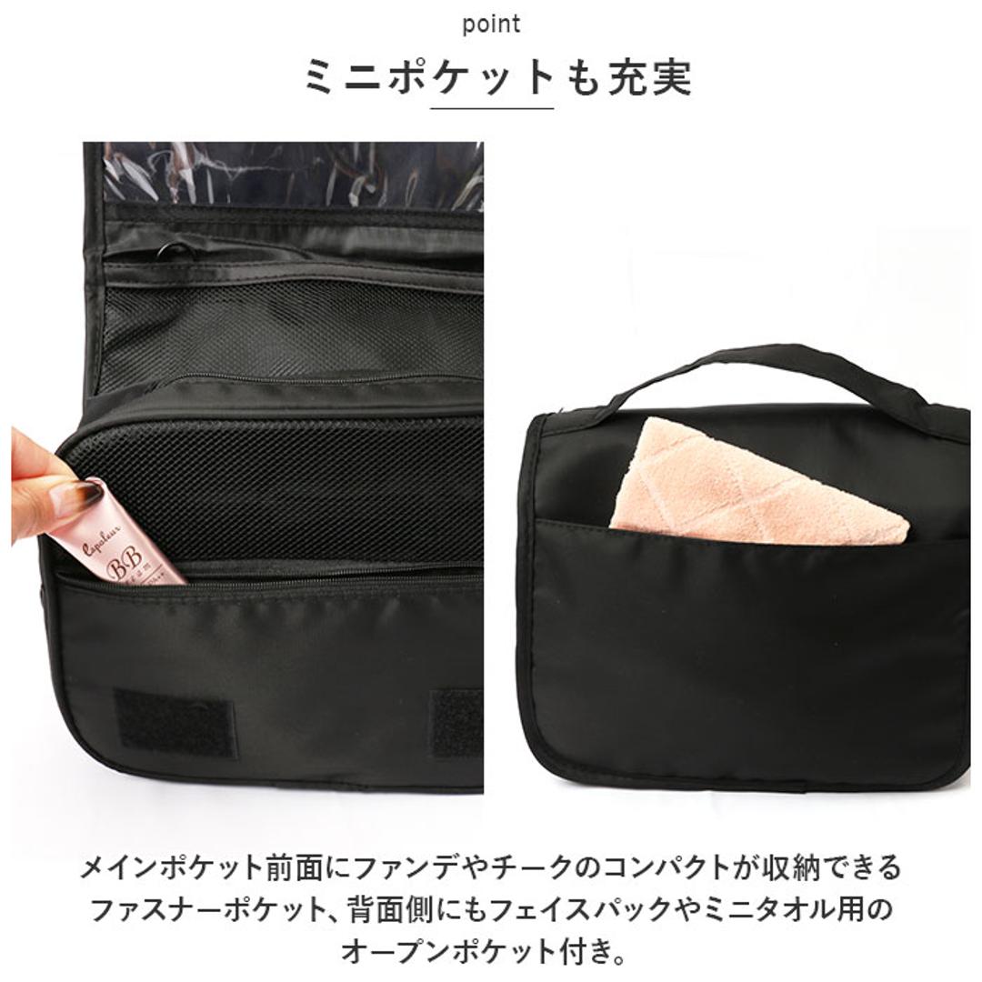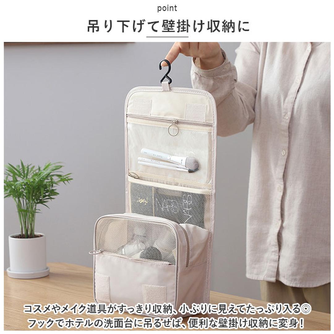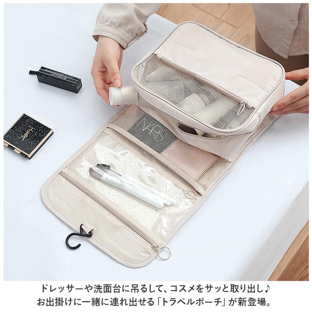 | 商品説明 | ・ドレッサーや洗面台に吊るして、コスメをサッと取り出し♪お出掛けに一緒に連れ出せる「トラベルポーチ」が新登場。 【吊り下げて壁掛け収納に】 ・コスメやメイク道具がすっきり収納できる、小ぶりに見えてたっぷり入るコスメポーチ。フックでホテルの洗面台に吊るせば、便利な壁掛け収納に変身! 【3つのスペースで整理整頓】 ・正面の面ファスナーフラップを開くと、内側には「クリアポケット」「メッシュポケット」「メインファスナーポケット」の3つに分かれた収納スペースを装備。 【防水クリアポケット】 ・上段のクリアポケットは、濡れたものを入れても安心な防水ポケット。衛生的にしまいたいメイクブラシや歯ブラシなどの洗面用具の収納に最適。 【ひと目で確認メッシュポケット】 ・中段のメッシュポケットは、リップやマスカラ、シャドーコンパクトなど細々としたアイテムの収納に便利。中の小物がひと目で確認できるのが嬉しいポイント。 【大容量メインポケット】 ・ファスナーで開くメインポケットにはミニ化粧水ボトルやフレグランスなどを立てたまま収納可能。仕切りやサイドポケット、ゴムベルトでボトルが固定できるから、ぐらつきや液漏れもしっかり防止。 【ミニポケットも充実】 ・メインポケット前面にファンデやチークのコンパクトが収納できるファスナーポケット、背面側にもフェイスパックやミニタオル用のオープンポケット付き。 【持ち運びもラクラク】 ・持ち手ハンドル付きなので、ドレッサーやバスルームまで、ポーチ単体でも持ち運びがラクちん。 【水滴は弾くはっ水加工生地】 ・ポーチの生地にははっ水加工が施されているので、洗面化粧台やバスルームなど、水回りで使用しても安心。 【使い方は自分次第】 ・コスメや洗面用具用のトラベルポーチとしてだけなく、スマホやモバイルバッテリー、イヤホンなどをまとめるガジェットポーチとしても大活躍。 |