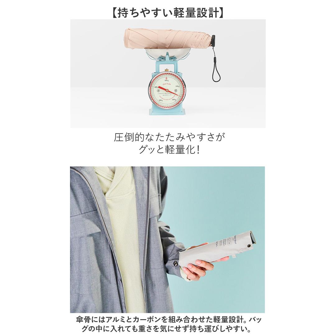 | 商品説明 | ・傘をたたむ手間と時間を大幅にカット!「Water front クイックシャット ライト 55cm」が登場。 【傘をまとめやすいシェイプメモリー機能】 ・傘生地の裏にパネルを配置したシェイプメモリー機能を搭載。時間がないときもクルッと回すだけで簡単にまとめられる◎ 【持ちやすい軽量設計】 ・傘骨にはアルミとカーボンを組み合わせた軽量設計。バッグの中に入れても重さを気にせず持ち運びしやすい。 【晴雨兼用タイプ】 ・紫外線をカットするUVケア機能つき!雨の日も晴れの日も、これ1本で2役と大活躍◎ 【安心の4級撥水加工】 ・雨粒をしっかりはじいてくれる、強い雨の日も安心の4級撥水加工! 【選べるカラー】 ・ユニセックスで使えるベーシックカラーやくすみカラーのバリエーション。お気に入りがきっと見つかる。 |
