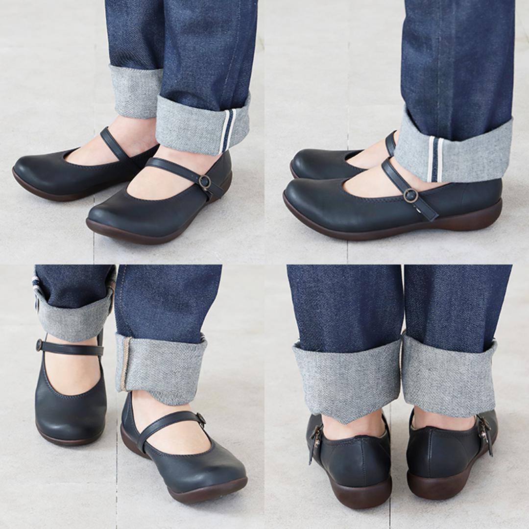 ・足の甲にルーズめに掛かる細めのベルトは、スナップボタン式で脱ぎ履きがラクチン。5段階のベルト穴付きで、自分の足の高さに合わせて調節が可能!ベルト根元がゴムになっているため、足の微妙な動きに対応。