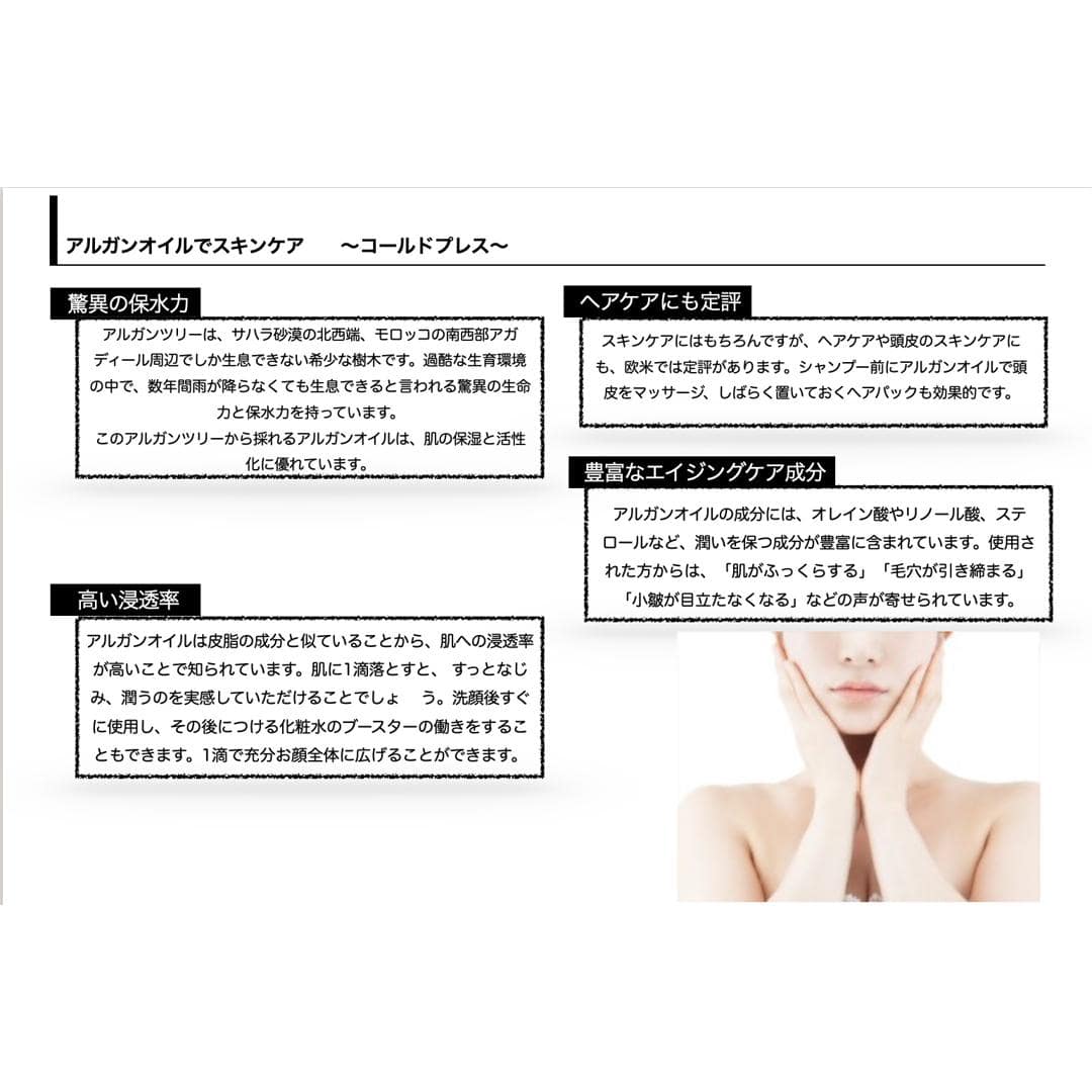 | 商品説明 | ・モロッコ王国のアガディール地方でしか生息しない希少な樹木から手に入る、モロッコ政府公認のアルガンオイル。日本へ直接お届けすることで、最高品質のアルガンオイル。実際に調査しますと「アルガンオイル」と表記されていても原液での販売はほとんどされてない。 ・このアルガンオイルは、ビタミンEが豊富に含まている。通常のオリーブオイルの2ー3倍ものビタミンEを含有。ビタミンEには抗酸化作用があり、美容や健康に優れた効果が期待できる。肌の乾燥やシワ、くすみをケアするだけでなく、髪や爪のトラブルにもアプローチ。 ・とくに、焙煎されていない非焙煎のアルガンオイルは、肌への浸透力が高く、角質層の奥までビタミンEを届けることができる。また、他の化粧品の成分の浸透をサポートする役割も果たしてくれる。毎日のスキンケアやヘアケアに取り入れると、一層の効果を実感できる。 ・アルガンオイルは使い方も多岐に渡る。例えば、顔や体のマッサージオイルとして活用したり、ヘアオイルとして髪のうるおいをキープしたり、ネイルやカットを整える時にも活躍。さらに、太陽に当たった後のアフターケアや乾燥が気になる季節にも、たっぷりと使用すると効果が大きい。 ・ぜひ、このモロッコ政府公認のアルガンオイルをお試しください。最高品質のアルガンオイルが、あなたの美容と健康をサポート |