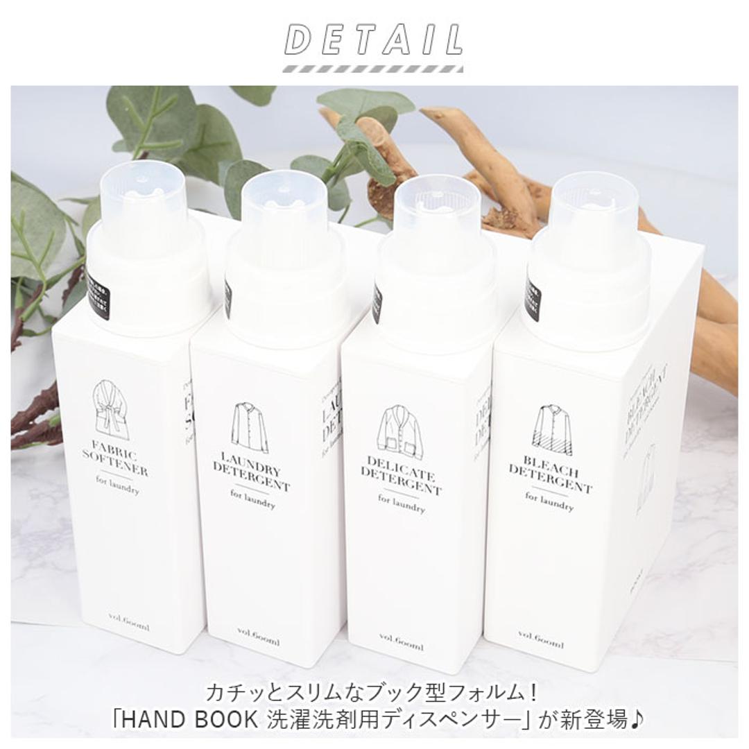 | 商品説明 | ・カチッとスリムなブック型フォルム!「HAND BOOK 洗濯洗剤用ディスペンサー」が新登場♪ ・サニタリールームのキャビネットに整然と並べて収納できる、文庫本のようにコンパクトな詰め替えボトル。 ・清潔感あふれる真っ白なボディに、線画の洋服イラストと、洗剤の種類を英文字で記したシンプルなルックスが好印象。 ・洗剤の液だれを防ぐ注ぎ口に、しっかりと締まるキャップ付きなので、扉付きの収納棚の中に収納するときでも安心。 ・市販の洗剤リフィルを詰め替えるのにちょうどいい、容量600mlタイプ。 ・「LAUNDRY DETERGENT(洗剤)」・・・衣類をすっきり洗う、一般的な洗濯用洗剤の詰め替えに。 ・「FABRIC SOFTNER(柔軟剤)」・・・ふんわりとした感触やよい香りをプラスする柔軟剤用に。 ・「BREACH DETERGENT(漂白剤)」・・・ワイシャツなどの衣類の白さを引き出し、除菌などに効果のある漂白剤用に。 ・「DELICATE DETERGENT(おしゃれ着用洗剤)」・・・型崩れを防いで、大切に長く着たい、デリケートな衣装用の洗剤に。 |