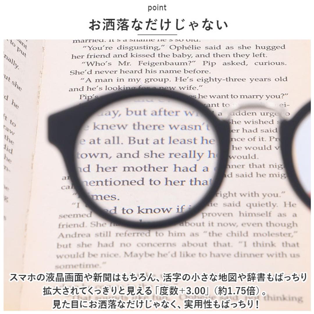 ・スマホの液晶画面や新聞はもちろん、活字の小さな地図や辞書もばっちり拡大されてくっきりと見える「度数+3.00」(約1.75倍)。見た目にお洒落なだけじゃなく、実用性もばっちり!