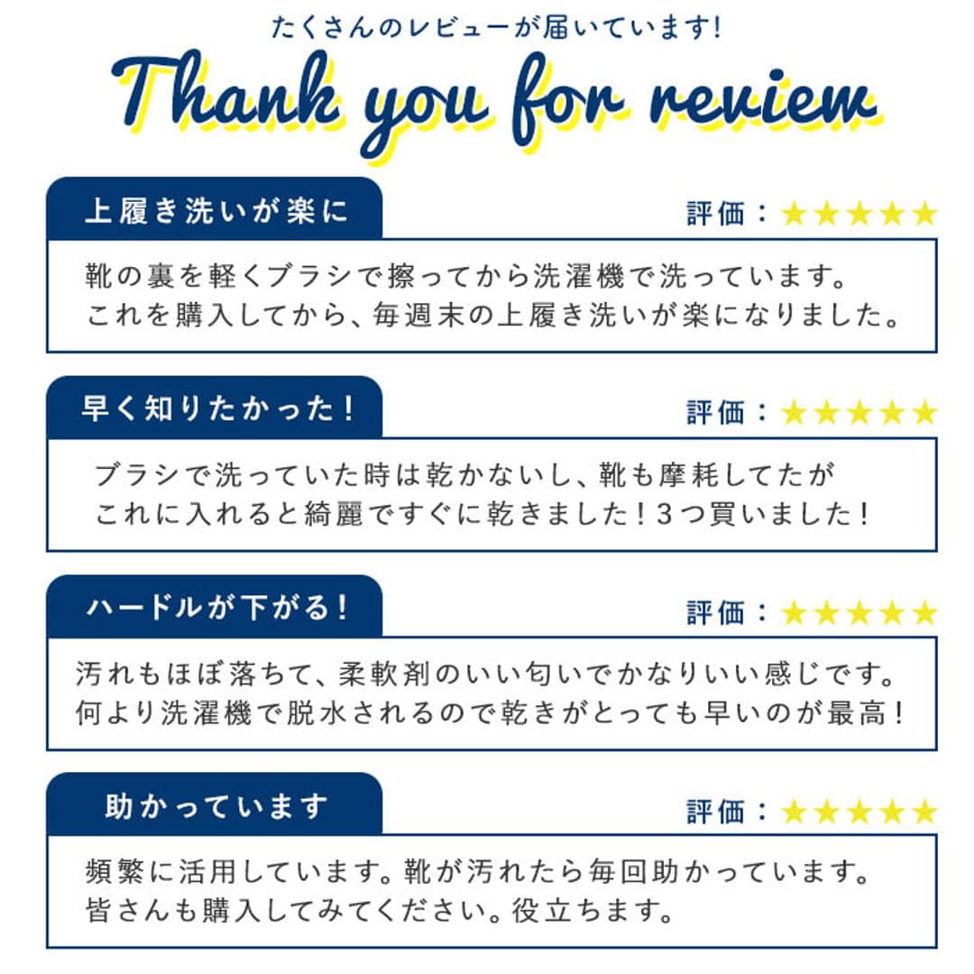 | 注意点 | ※高額なシューズ、革靴、生地の柔らかいシューズ、装飾のあるシューズは破損の恐れがございますのでご使用にならないでください。 ※シューズの靴底の特性によっては十分に脱水ができない場合があります。 ※シューズの破損、洗濯機の故障の原因になりますので土や泥、溝に詰まった石などは必ず落としてからご使用ください。 ※破損の原因になりますので乾燥機、乾燥機能を使用しないでください。 ※煮沸や熱湯消毒、漂白剤のご使用は避けてください。 ※廃棄時は、各自治体の定める方法に従って処理してください。 ※カメラやモニターの性質により、画像と実物の色の違いがある場合がございますのでご理解願います。 |