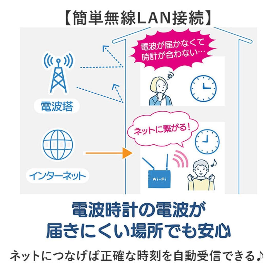 | 商品説明 | 【ネット接続で時刻を同期】 ・電波の届かない場所でも安心、無線LAN接続で時刻を自動受信する掛け時計。 【簡単無線LAN接続】 ・ネットにつなげば正確な時刻を自動受信できる♪ 【アプリ不要の簡単設定】 ・専用アプリをダウンロードする必要がなく、シンプルな操作だけで無線LANに接続できる◎ 【なめらか連続秒針】 ・カチカチ音がしない連続秒針タイプで、静かな空間でも気にならない〇 【シンプルデザイン】 ・見やすいサイズ感と、どんなインテリアにも合わせやすい飽きのこないフォルム。 【軽量で設置ラクラク】 ・壁への取り付けも簡単で場所を選ばずに設置!※必ず別売りのアルカリ乾電池をご使用下さい。 |