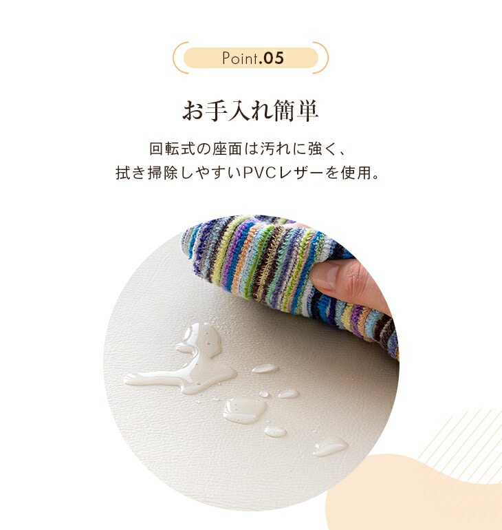 厚みのあるクッションでしっかりとした座り心地の回転式こたつチェア。脚部には仕切り板が付いているので、こたつの熱が逃げにくい仕様です。座面が360度回転式なので、椅子を引かなくても楽に立ち座りができます。座面は汚れに強く、拭き掃除しやすいPVCレザーを使用。背もたれ付きでソファーのようなボリューム感。座りやすい大判の座面です。