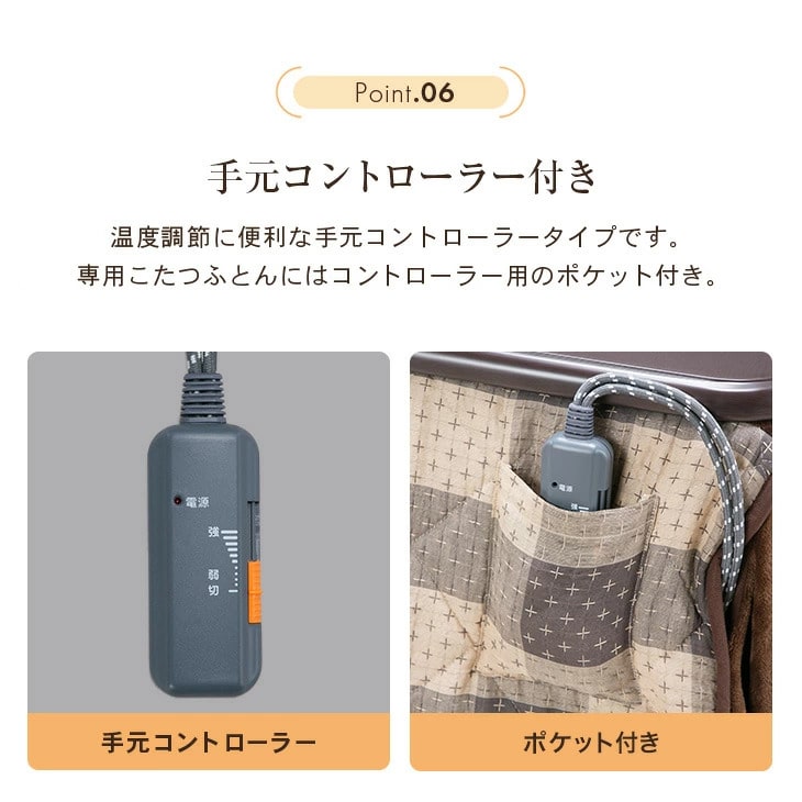 ●仕様/テーブル:ヒーター電源:AC100V(50/60Hz)、消費電力:600W、ヒーター定格電圧:交流100V、ヒーター発熱体:石英管ヒーター300W×2本、ヒーターコード:2.8m(手元コントローラー付き)、ヒーター温度調節方式:無段階調節ファン付き(華芝ジャパンKJU-600FC)、ふとん:両面リバーシブル(フランネル面:はっ水加工)