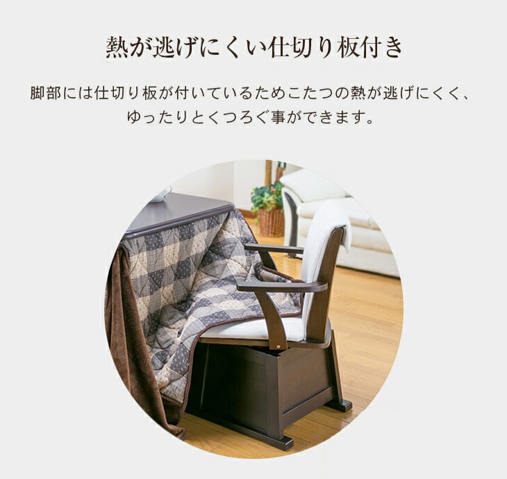 厚みのあるクッションでしっかりとした座り心地の回転式こたつチェア。脚部には仕切り板が付いているので、こたつの熱が逃げにくい仕様です。座面が360度回転式なので、椅子を引かなくても楽に立ち座りができます。座面は汚れに強く、拭き掃除しやすいPVCレザーを使用。背もたれ付きでソファーのようなボリューム感。座りやすい大判の座面です。