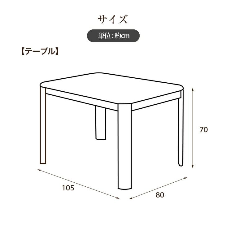 ●サイズ/テーブル:約幅105×奥行80×高さ70cm、ヒーター寸法:約幅29×奥行29×高さ5cm、ふとん:約幅230×奥行255cm、チェア(1脚):約幅56.5×奥行55.5×高さ79cm、座面高:41cm