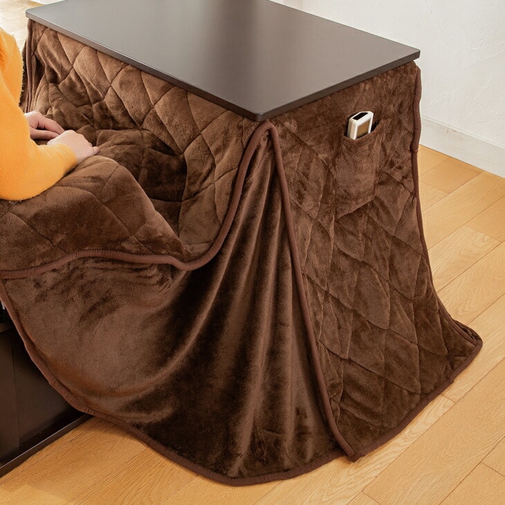 両面肌触りの良いフランネル生地を使用した専用こたつ布団はコーナー部分にスリットが入っているため、布団が広がらず省スペースに使えます。リモコンが入るポケット付きでケーブルを通す穴もあいています。