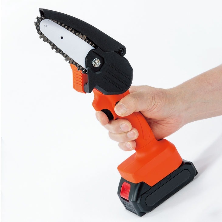 充電式&小型で持ち運びもラク。庭木の剪定や太枝をパワフル切断。使いやすさとチェーンソーの切れ味を両立。太枝もスパッと切断。高硬度と耐摩耗性に優れたチェーンで、樹皮への損傷を抑え枝を素早く剪定します。誤作動を防ぐ安心のセーフティーボタン付き。切削粉の跳ね返りを防ぐカバー付き。滑り止めハンドルで安心。LEDライト付きで、夜間や薄暗い場所での作業もできます。