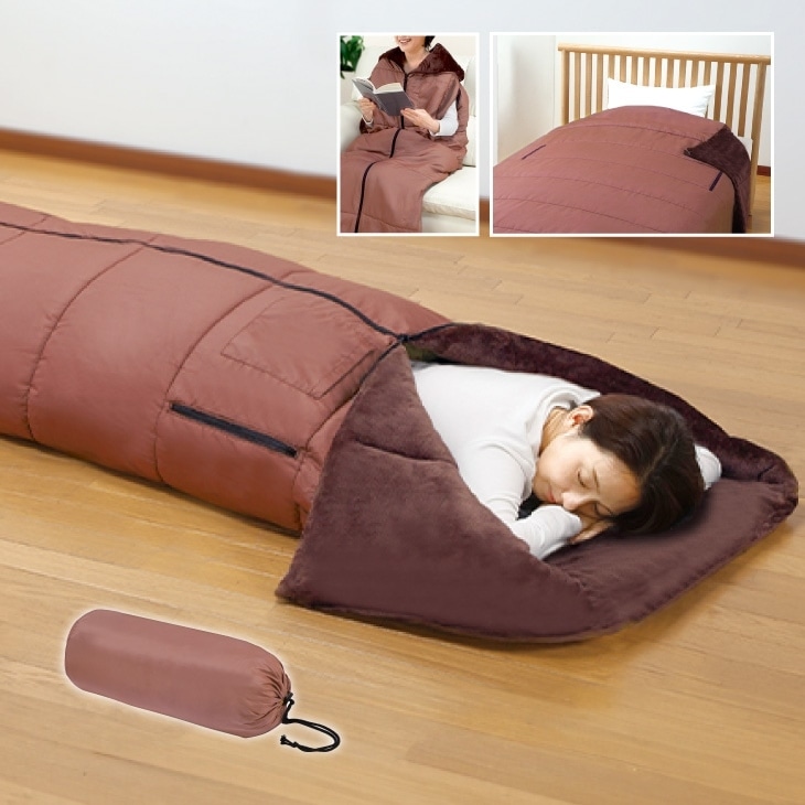●色/ブラウン ●サイズ(1枚)/約150×210cm、寝袋時:約75×210cm、収納時:約22×55cm ●重さ(1枚)/約1.44kg ●素材/表地:ポリエステル100%(撥水加工)、中身:ポリエステル100%保温綿・ポリプロピレン100%アルミ蒸着シート、裏地:ポリエステル100%(フリース生地) ●備考/丸洗いOK(ネット使用) ●製造国/中国製