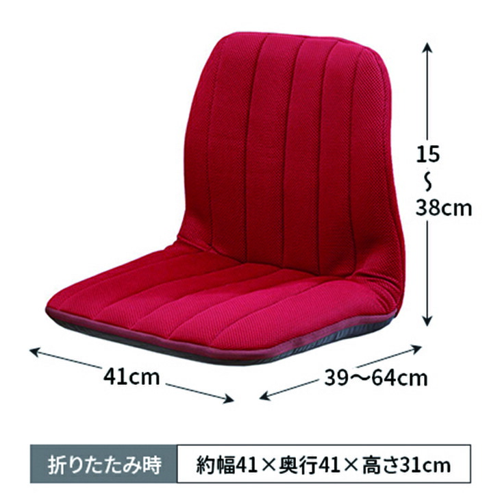●色/ダークブラウン、ブラック、レッド ●サイズ(1個)/使用時:約幅41×奥行39~64×高さ15~38cm、折りたたみ時:約幅41×奥行41×高さ31cm ●重さ/約2.1kg ●素材/[本体カバー]表地:ポリエステル(メッシュ)・裏地:ポリエステル、[中材]鋼・ウレタンフォーム ●備考/背もたれ12段階リクライニング ●製造国/中国製