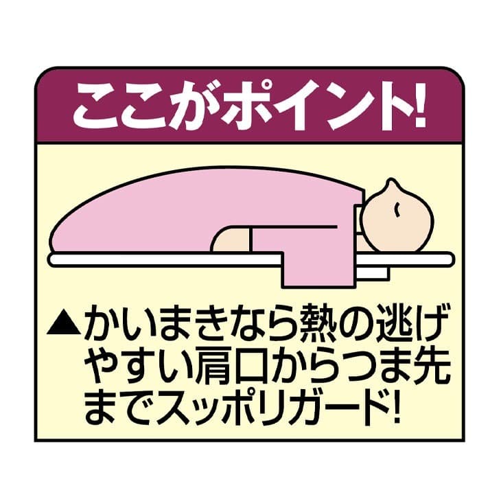 柔らかな肌触りの毛布を裏地から衿側まで使用したかいまき布団。全体を優しく包み込み、夜の冷え込みからしっかりと守ります。遠赤わたをはさんだ3層構造により、しっかりとした保温性を発揮。熱の逃げやすい肩口からつま先までしっかりガードしますので、寒さでよく眠れない方や寝ぞうが悪い方にもおすすめです。また、足ポケットのあるデザインで、足先の冷えも防ぎます!