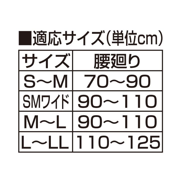 ●適応サイズ/S~M(身長約150~170cm、腰廻り約70~90cm)、M~L(身長約165~188cm、腰廻り約90~110cm)、L~LL(身長約165~188cm、腰廻り約110~125cm)、S~Mワイド(身長約150~170cm、腰廻り約90~110cm)