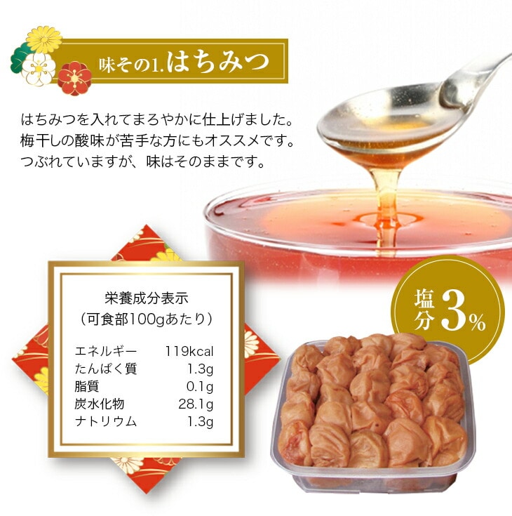 塩分を3%まで落とした梅干です。ハチミツを入れてまろやかに仕上げましたので梅干が苦手な方、塩分が気になる方にお勧めです。つぶれていますが味はそのままです。