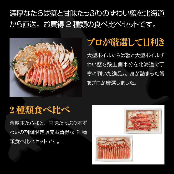 濃厚なたらば蟹と甘味たっぷりのずわい蟹を北海道から直送。期間限定販売のお買得な2種類の食べ比べセットです。