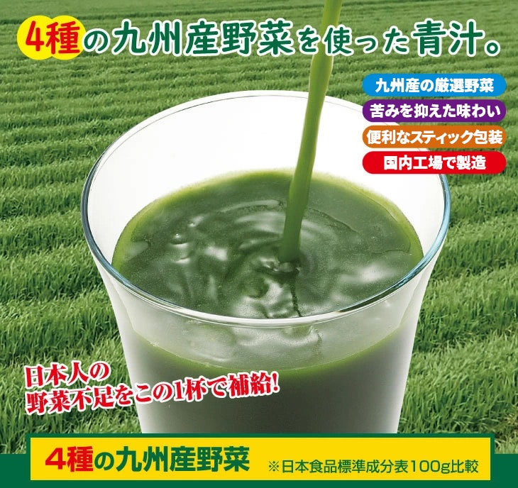 4種の九州産野菜を使った青汁。 厳選野菜を飲みやすい配合で仕上げた青汁。苦さを抑えた味わいなので、お年寄りからお子様までお手軽にご飲用いただけます。 牛乳、ヨーグルト、はちみつなどを加えても美味しい人気の青汁。 携帯にも便利なスティックタイプ。
