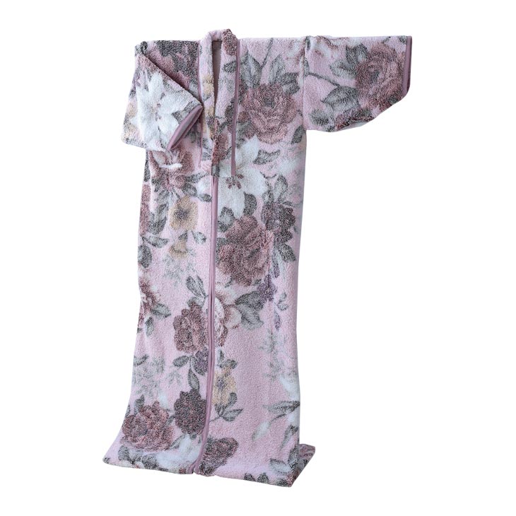 吸水性・耐久性に優れたタオル地国産かいまき。毛布と同じ地系にパイルを縛る作り方でパイルが抜けにくく耐久性抜群!衿部分もパイル仕様で心地良い肌触り。柄はぼかした涼し気なおぼろ調プリント。夏は一枚で肌掛けに、冬は内掛けにと、一年中ご使用いただけます。