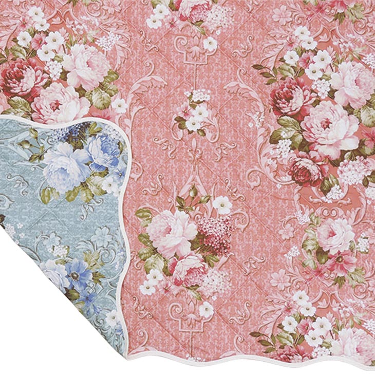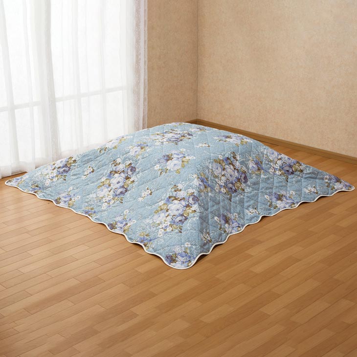 ふっくらした中わた入りのバラ柄こたつ上掛け。中わたがズレにくいキルティング仕様。ソファやベッドのカバーとしても使え、丸洗いもできるとても便利な一枚です。洋室・和室にも。