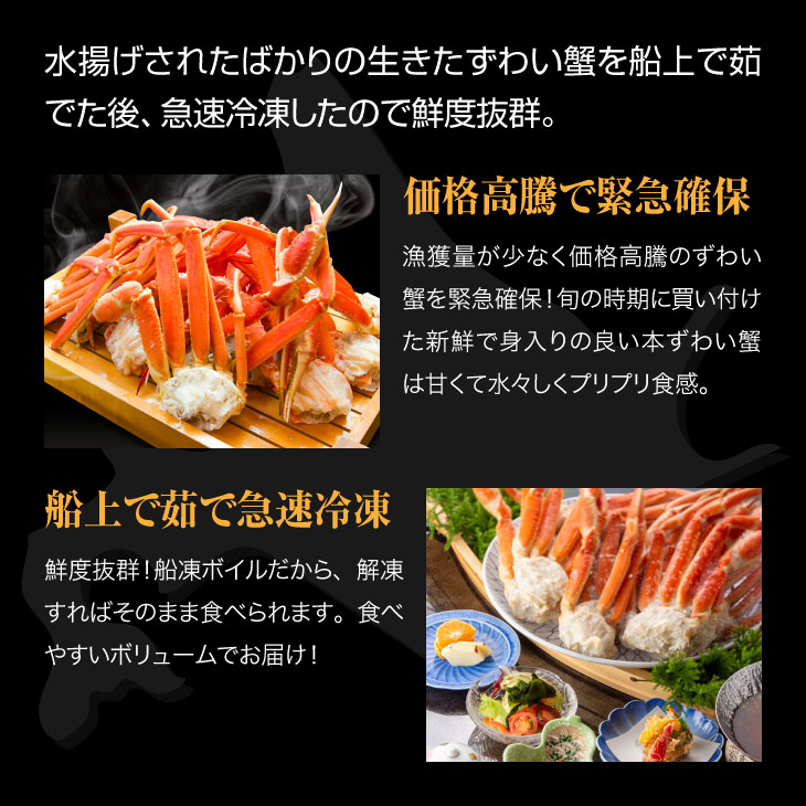 本ずわい蟹肩付き脚肉のたっぷり3Lお徳用企画!漁獲量が少なく価格高騰のずわい蟹を緊急確保!旬の時期に買い付けた新鮮で身入りの良い本ずわい蟹は甘くて水々しくプリプリ食感。水揚げされたばかりの生きたずわい蟹を船上で茹でた後急速冷凍したので鮮度抜群!