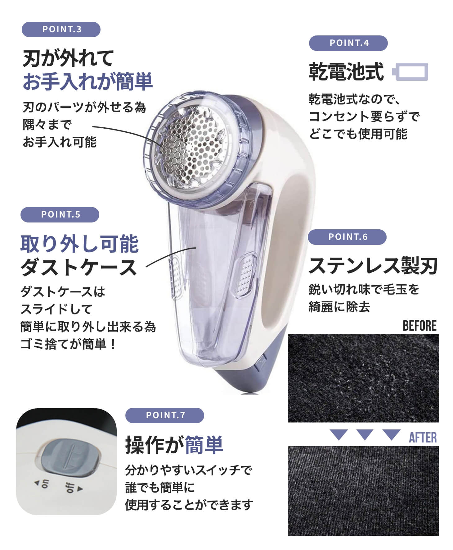 大きなセーターやアウターも簡単に毛玉が取れます。 ダストケースはスライドして簡単に取り出し可能でゴミ捨て簡単! 風合いガードで生地を傷めずに毛玉をカットします。 分かりやすいスイッチで誰でも簡単に使用することができます。