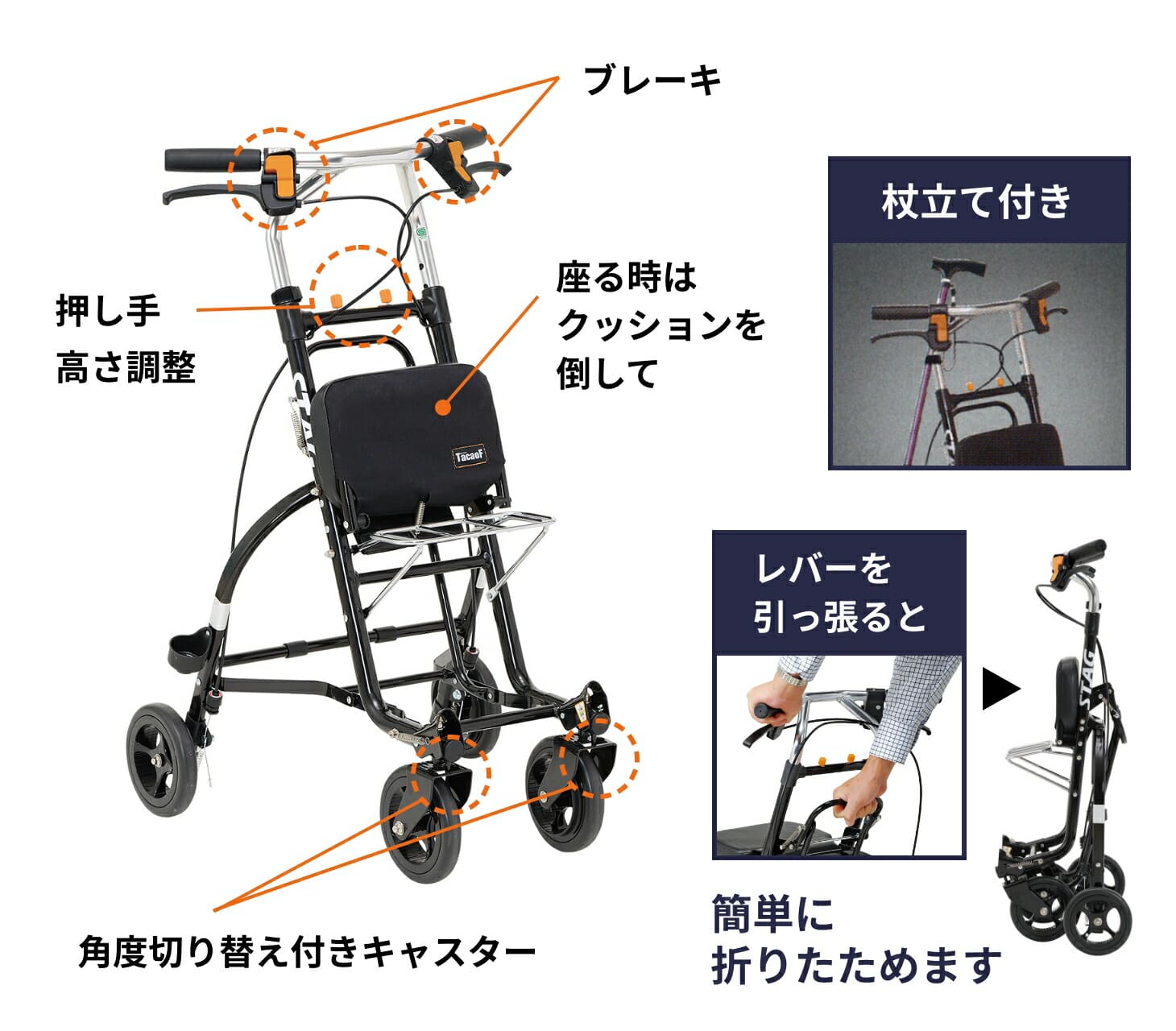 折りたたみ寸法:幅51.5×奥行30.5×高さ88cm、 手押し高さ:81.5~96.5cm(7ポジション)、座面寸法:幅26×奥行23cm、ゴムロープ長さ:75cm、座面高:約47cm