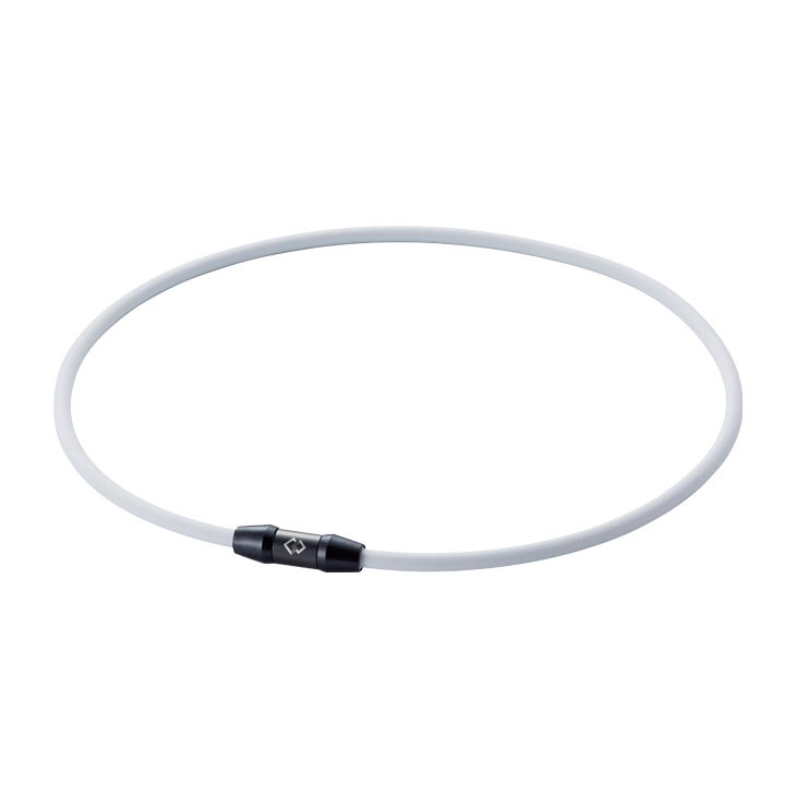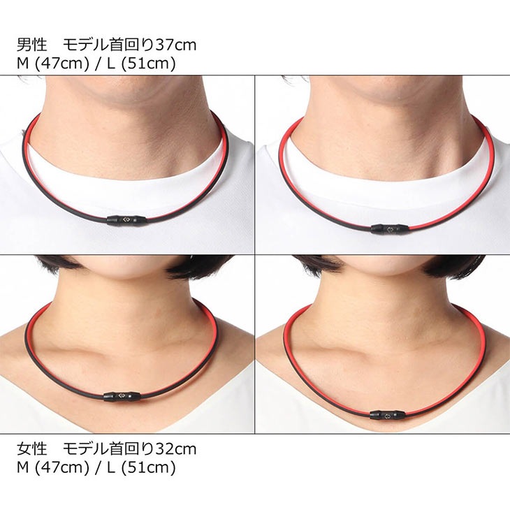 ●色/ブラック×ブラック、ホワイト×ブラック、レッド×ブラック、スカイブルー×ブラック ●サイズ/M、L ●適応サイズ/M:約長さ47cm、L:約長さ51cm ●重さ/M:約11.5g、L:約12g ●素材/ネックループ部分:シリコン・希土類永久磁石、トップ:POM・SUS316L(イオンプレーティング加工) ●仕様/磁石:希土類永久磁石140ミリテスラ8個をN極S極交互配列 ●備考/1年間保証書付き ●製造国/日本製