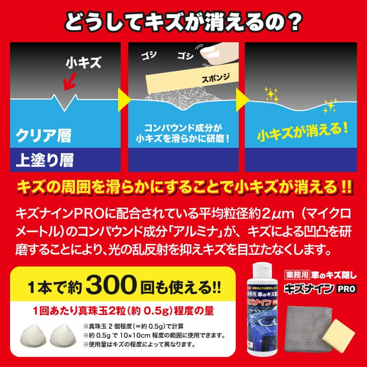 「キズナインPRO 業務用」は、サッと拭くだけで車の小キズを目立たなくする日本製の商品です。微細成分が小キズを研磨し、その効果を発揮します。小キズに加え、ヘッドライトの黄ばみやドアノブの密着汚れにも効果を発揮します。どんな色の車にも使用可能で、業務用ならではの仕上がりが期待できます。1本で約300回使用可能です。