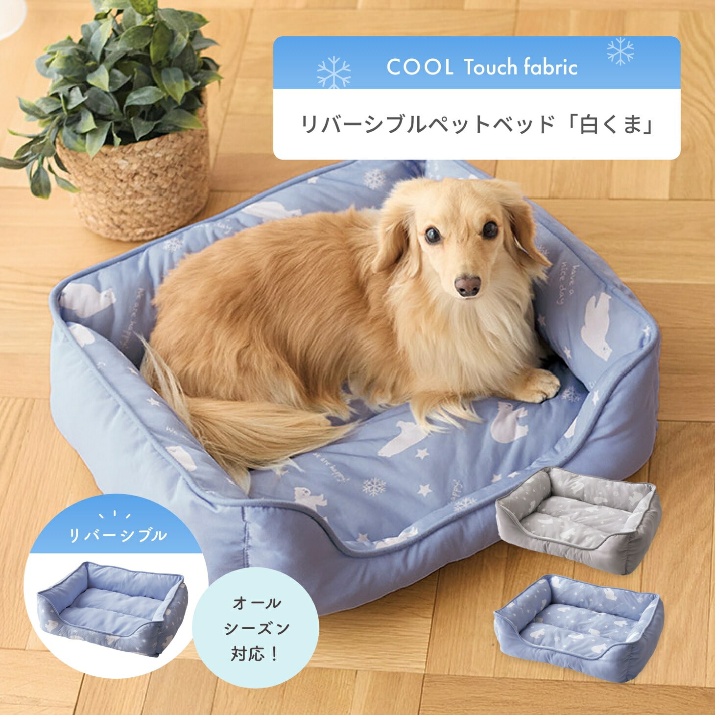 夏は白くま柄の接触冷感生地を表に、その他の季節は無地カラーの生地を表にして使用してください。