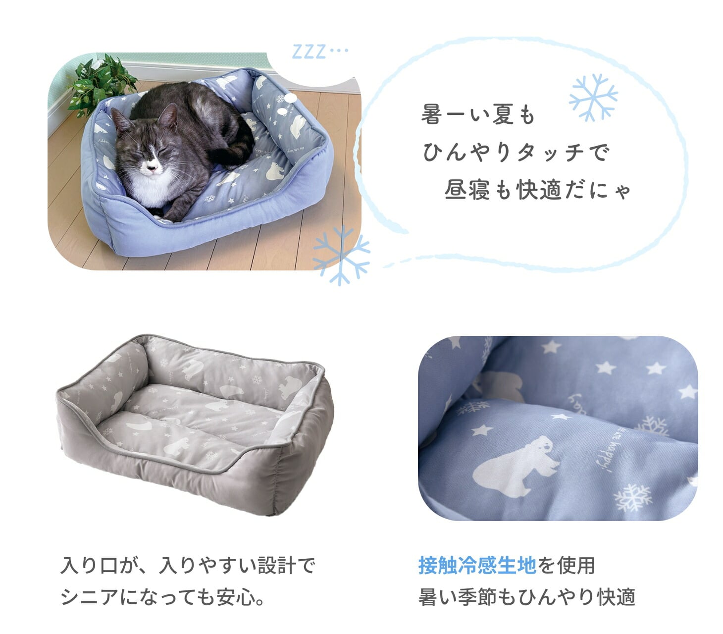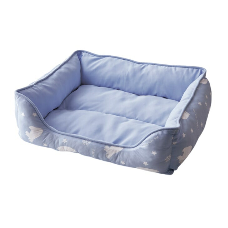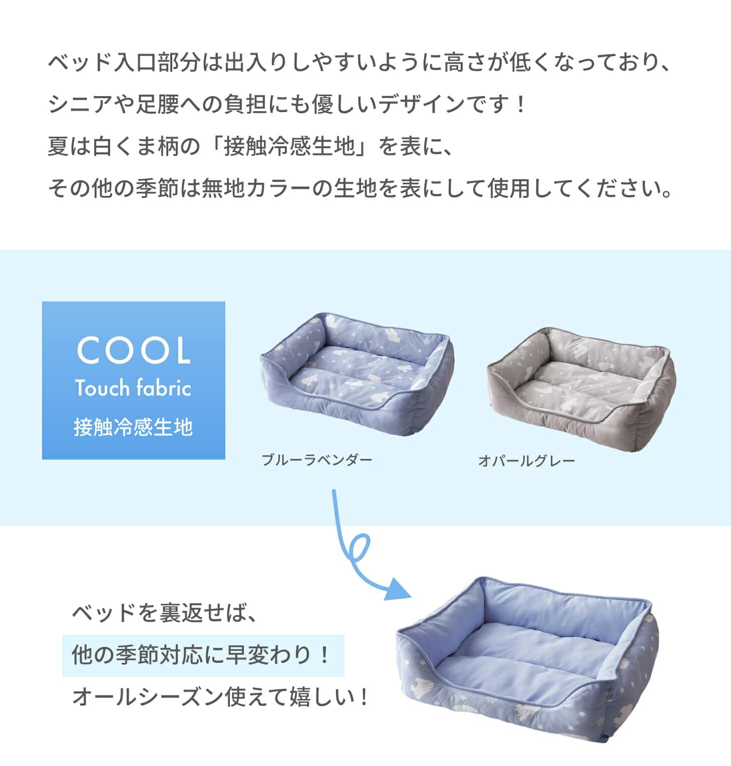 ベッド入口部分は出入りしやすいように高さが低くなっており、シニアや足腰への負担にも優しいデザインです! 夏は白くま柄の接触冷感生地を表に、その他の季節は無地カラーの生地を表にして使用してください。