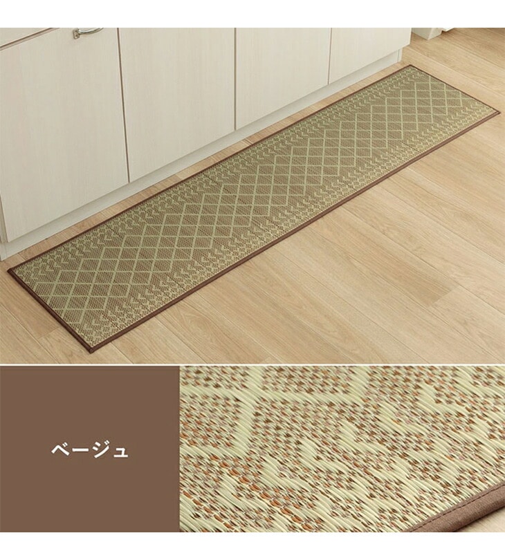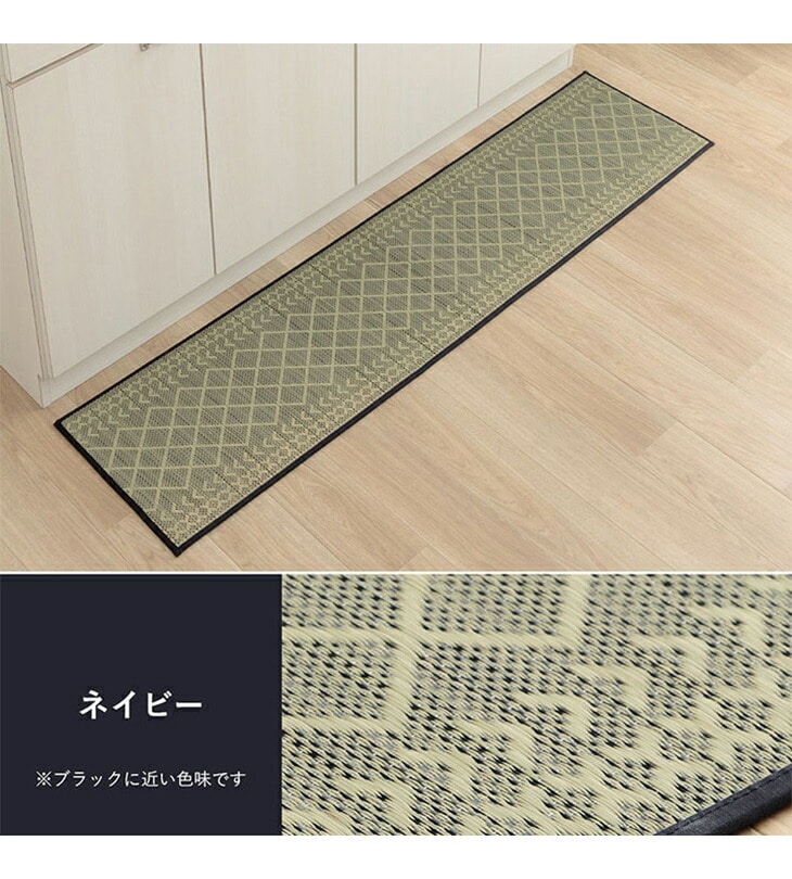 ナチュラルな雰囲気でどんなキッチンにも合わせやすいデザインに仕上げました。 キッチンの大きさ・広さに合わせることができるよう、多サイズ展開しています。 サラっとして素足にもやさしい素材です。 トレンド柄の幾何柄を取り入れたデザインで、シンプルな色味でオシャレなキッチンに仕上がります。 裏地には国産のウレタンフォームを使用することで、丈夫でクッション性がありすべりにくくしました。 青森県のヒバの木から抽出した「ヒバエッセンス」をメーカー独自の技術で生地表面に加工しました。 ヒバエッセンスにはヒノキチオールという天然物質が含まれており、抗菌防臭効果が期待されます。 ●色/ベージュ、ネイビー ●サイズ/約 幅43×奥行240×高さ0.8cm ●重さ/約1.9kg ●素材/表地:い草、裏地:ウレタンフォーム6mm ●製造国/日本製