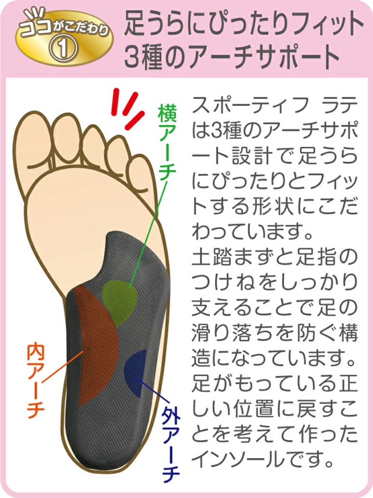 横、内、外と3種のサポート設計で足裏にぴったりフィットする形状にこだわっています。