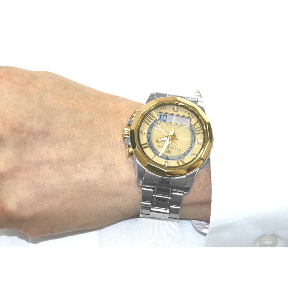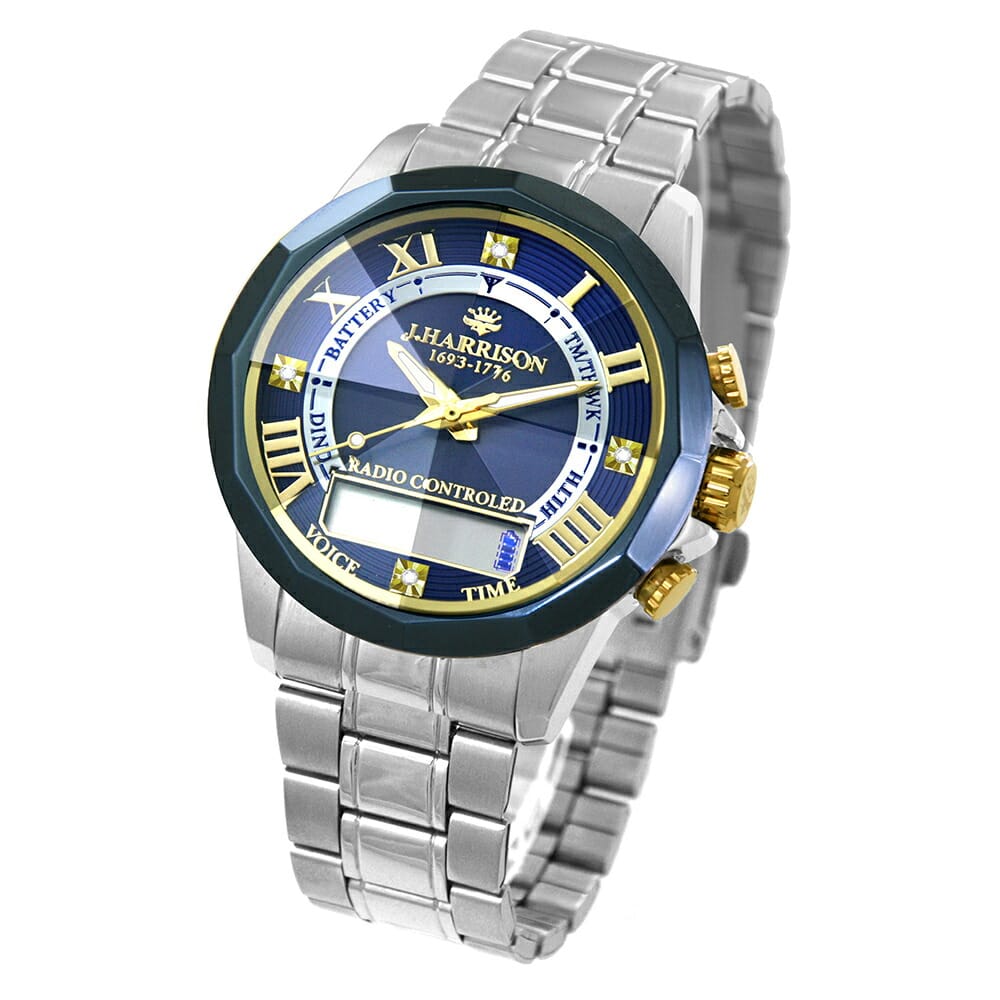 音声で時刻、日付曜日を知らせる 歩数計付電波腕時計です。 音声で時刻、日付曜日を知らせる歩数計付電波腕時計です。電波受信機能を搭載したアナログボイスウォッチです。ワンプッシュで時間と日付を音声でお知らせしてくれます。音声はプロ女性アナウンサーの肉声を採用、とても聞き取りやすい音声が流れます。 歩数計付き電波腕時計は3D加速度センサーを搭載しております。通勤や通学時に装着したい方におすすめ。 ●色/ブラック・ネイビー・ゴールド ●サイズ/約 幅4.8×奥行53.5×高さ1.8cm、腕回り長さ22.5cm ●重さ/約154g ●素材/ガラス:クリスタルガラス、ケース・ベルト:ステンレス、裏キャップ:ステンレス、留め金:ステンレス(スライド式)、天然ダイヤ:4石天然ダイヤモンド付き ●備考/1年間保証書付き、時刻、日付、曜日アナウンス、歩数計付き機能、電波受信、定時受信、強制受信、リセット機能、歩数計機能、受信電波:福島送信所40kHz・佐賀送信所60kHz、両局自動選局受信(1日最大3回)、非生活防水、月差±30秒(電波非受信時)、留め金:両側プッシュ二つ折りタイプスライド式 ●製造国/中国製