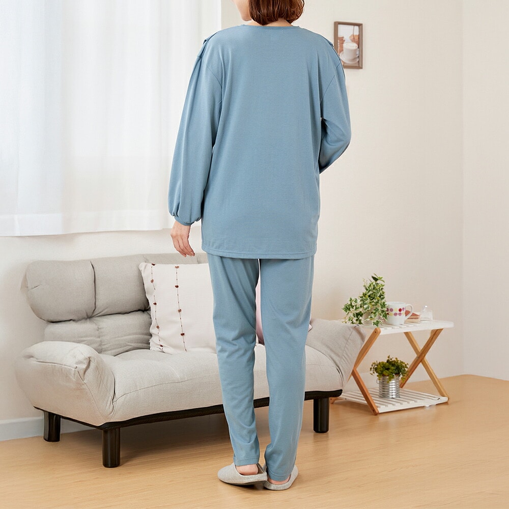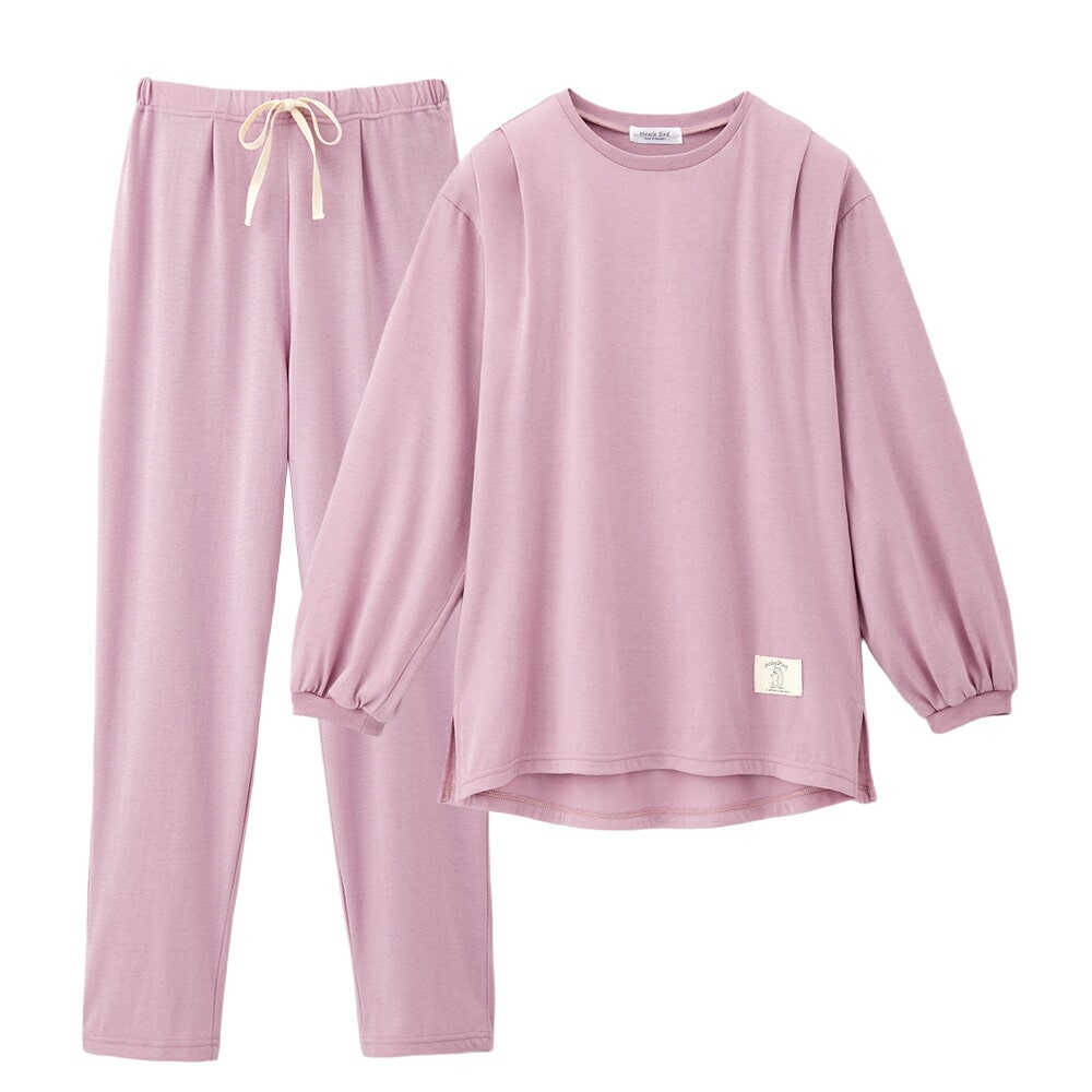 おうち時間を快適に!着心地やわらかな「綿混長袖ホームウェア2色組」 「家ではとことんリラックスしたい」「締め付けのない、ゆったりした服が欲しい」そんな方におすすめの、着心地にこだわった婦人向けホームウェアです。柔らかい綿混素材を使用し、ゆったりとしたルーズシルエットに仕上げました。お部屋でのくつろぎタイムや、ちょっとした家事の際も、ストレスフリーで快適に過ごせます。 肌にやさしい綿混素材 ポリエステルと綿をバランスよく配合した素材は、肌触りが柔らかく、通気性も◎。オールシーズン快適に着られます。 ストレスフリーなゆったり設計 動きやすいゆるシルエットと、締め付け感のないウエスト総ゴム(ゴム取替口付き)仕様。さらに、裾にはさりげないスリットが入っており、どんな姿勢でも動きやすい工夫がされています。 便利なポケット付き パンツの右後ろにはポケットが付いているので、スマホや鍵など、ちょっとした小物を入れるのに便利です。 気分が上がるやさしいカラー やわらかくフェミニンな印象のピンクと、落ち着いた爽やかなブルーグリーンの2色セット。着回しがしやすいので、洗い替えにも便利です。