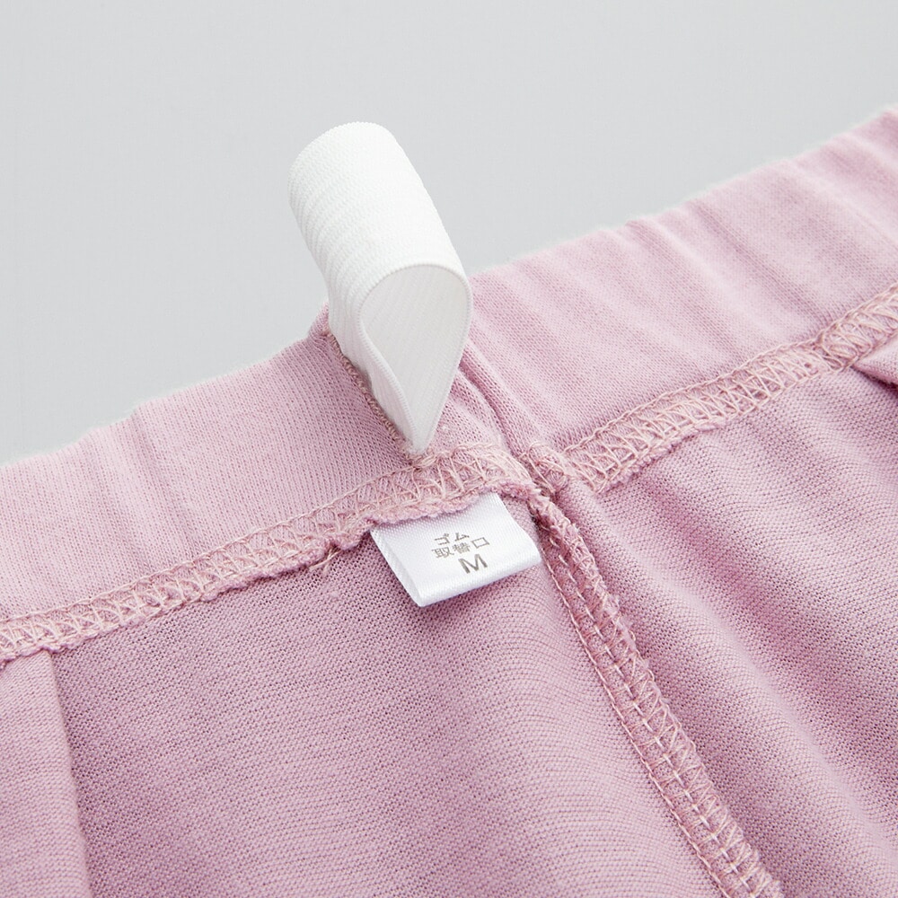 動きやすいゆるシルエットと、締め付け感のないウエスト総ゴム(ゴム取替口付き)仕様。さらに、裾にはさりげないスリットが入っており、どんな姿勢でも動きやすい工夫がされています。