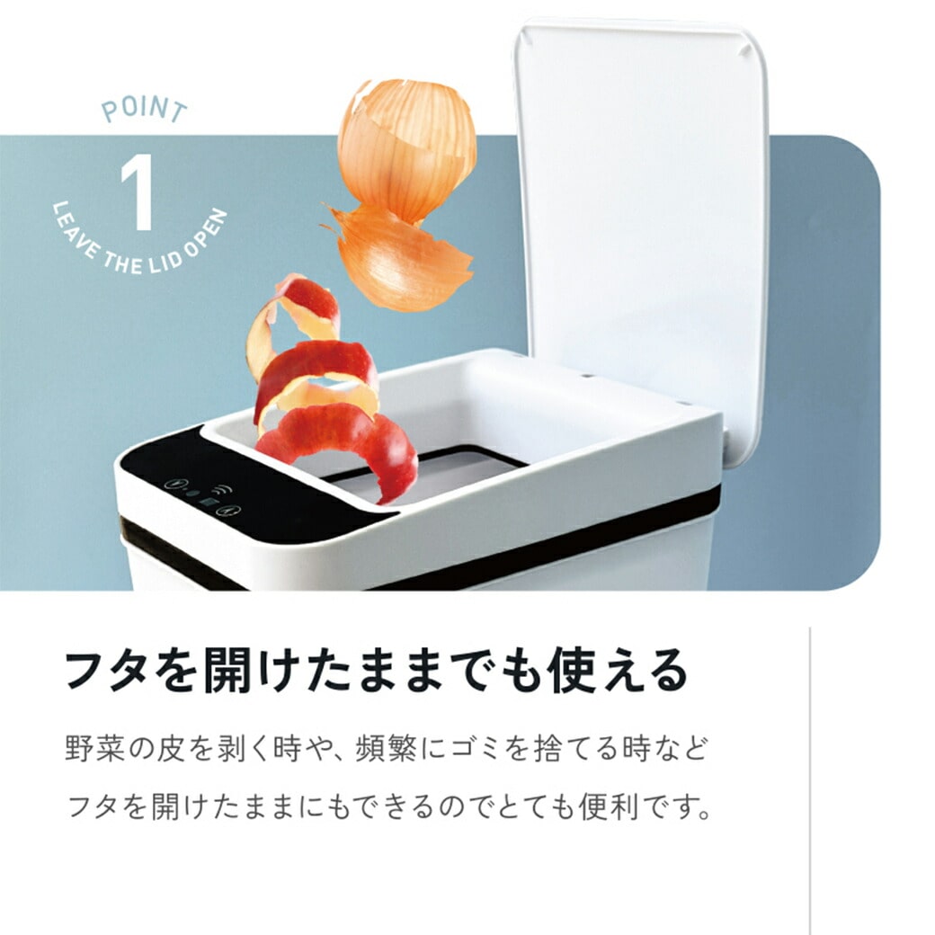 触れずに衛生的!スリムな自動開閉ゴミ箱(12L) 「料理中で手が汚れている」「両手がふさがっているからフタが開けられない」そんなお悩みを解決する、センサー式の自動開閉ゴミ箱です。手をかざすだけでパッとフタが開き、ゴミ捨てがスムーズに。手が離せない時は、膝を曲げてセンサーを感知させればサッと開きます(感知距離最大20cm)。 密閉性が高く、ニオイ漏れを防ぐ フタは密閉性が高まるように設計されているため、気になる生ゴミの臭気や残留物をしっかりブロックします。キッチンでも衛生的にお使いいただけます。 スリムなのに大容量 横幅はわずか約15.8cmと非常にコンパクト。場所を選ばずに設置できるスリム設計なのに、ゴミの容量は約12Lとたっぷり入ります。 開けっ放し機能で便利 野菜の皮むきや料理中など、頻繁にゴミを捨てる際は、フタを開きっぱなしにもできます。使用後は自動で閉まるので、生活スタイルに合わせて使い分けが可能です。 清潔感のある丈夫な素材 本体は丈夫でなめらか、清潔感のあるABS樹脂を使用。汚れてもサッと拭き取れてお手入れ簡単です。