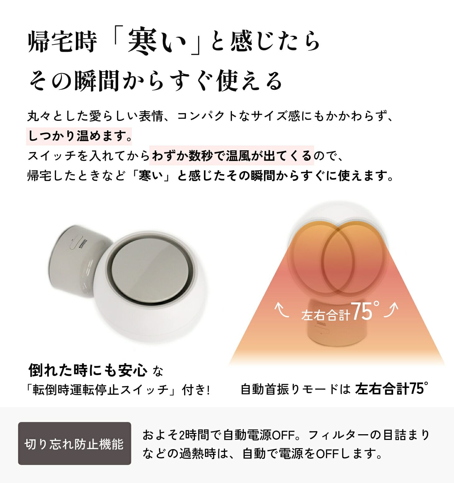 「寒いと感じた瞬間、すぐに温まりたい」「足元を温めるコンパクトでおしゃれなヒーターが欲しい」そんな方にぴったりの、丸く愛らしいデザインのセラミックヒーターです。スイッチを入れてからわずか数秒で温風が吹き出す速暖機能が魅力。帰宅時や、脱衣所でのヒートショック対策など、「寒い」と感じたその瞬間からすぐに使えます。