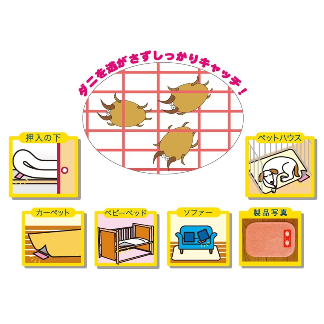 気になるところに敷くだけで簡単ダニをを捕獲。薬を使わないのでアトピー・アレルギー・ぜん息対策に安心してお使いいただけます。 ダニ捕り用に開発された特殊誘引剤(食品添加物)に誘われて生地に入ったダニを強力粘着テープにより捕獲しますので、死骸やフンが空気中に飛び散ることもありません。同封の「使用期間シール」に使用開始日を記入して、お取替えください。期限が過ぎたダニシートは一般ゴミとして処分できます。