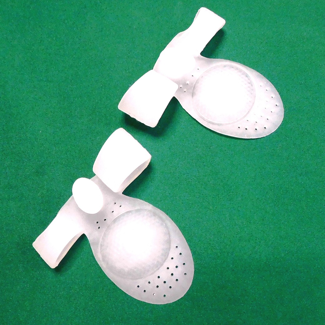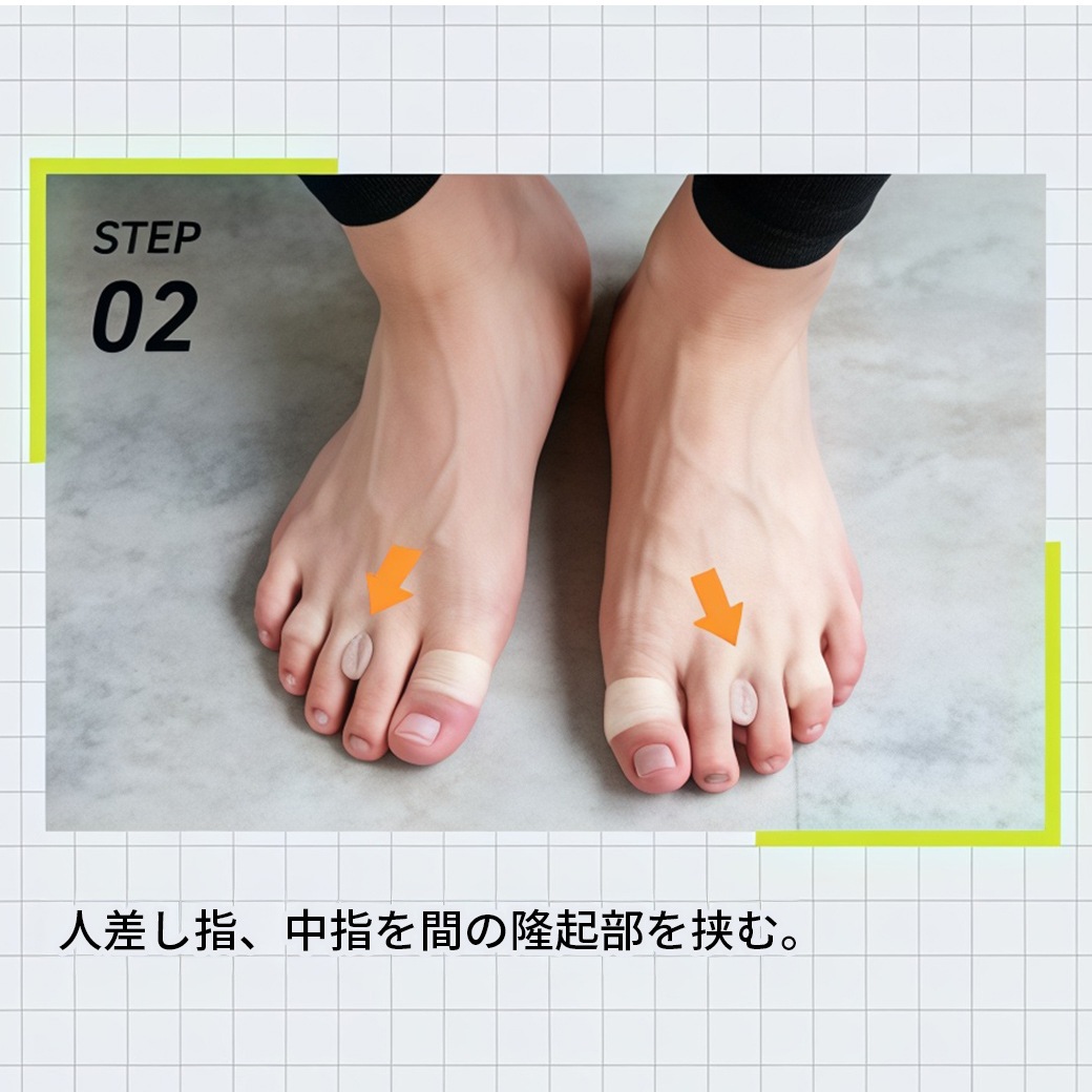 着用方法:人差し指と中指の間に隆起部を挟み、装着した状態で靴下を履く。