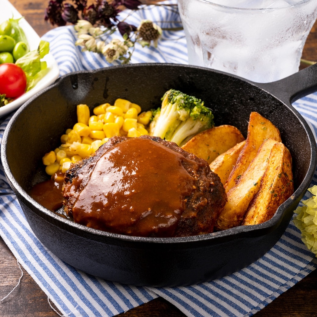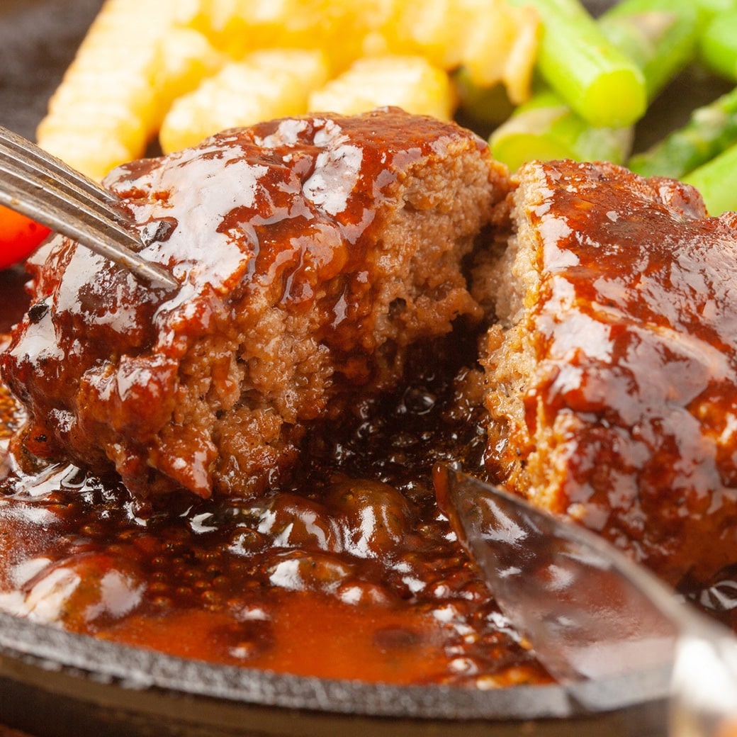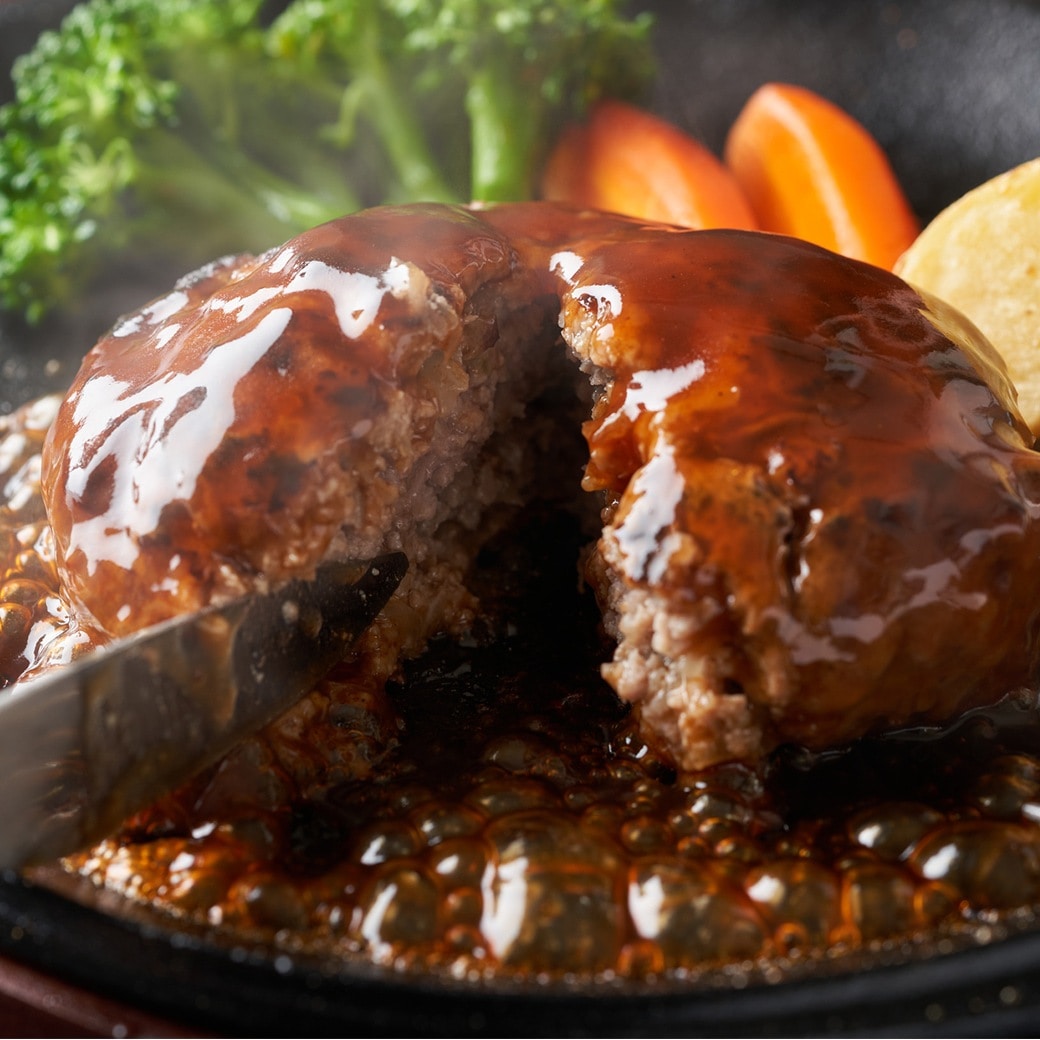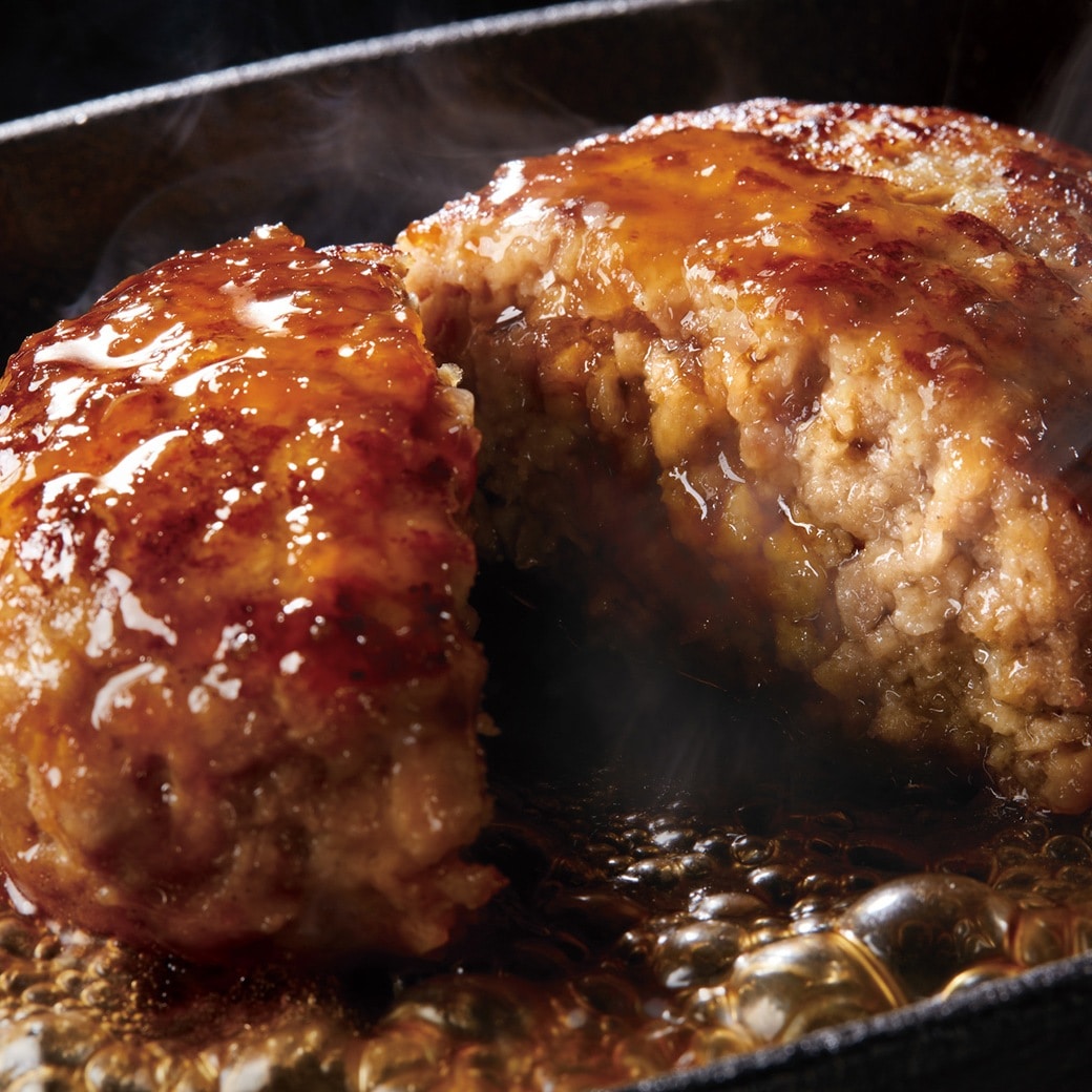黄金比率でブレンドした合挽ハンバーグは肉の旨みを最大限に引き出した逸品です。